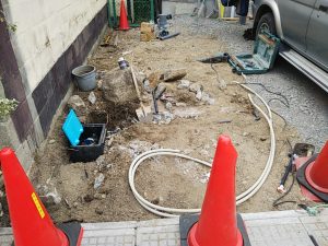一部屋内では各部水栓金具の取付、屋外では外構工事の下準備としての水道配管を行い、通水もしてもらいました。