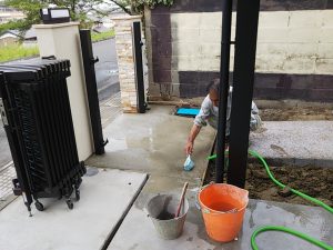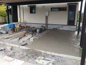 外構工事 駐車場の土間コンクリートが打設されました。今回は大きなカーポート屋根が掛かりますので作業的にはあまり心配ないのですが、何とか雨が降らないように祈りながらの打設作業になります。