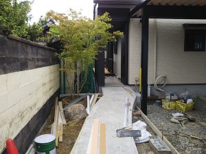 アプローチは下地が完成。造作工事中はポーチの段差を上るのに結構気合がいりましたが、これで楽に出入りする事ができます。アプローチ脇にはモミジが植樹されました。この後両脇に低木が植えられていく予定です。
