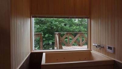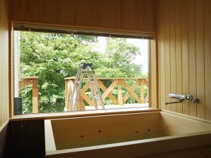 長期優良住宅の規定ではこういった浴室などの配管は交換できるようにつくっておく必要がありますが、通常の在来浴槽ではそれができません。申請時、詳細図を描きながらなんとか成立させる方法は無いものかと頭をひねりながら工夫を凝らした方法で配管工事を施し、何とか浴室をつくり上げる事ができました。苦心の跡は仕上げの羽目板や御影石の裏側に隠れて見えなくなっていますが、その集大成とも言うべき完成を見る事ができ、感慨深いものがあります。