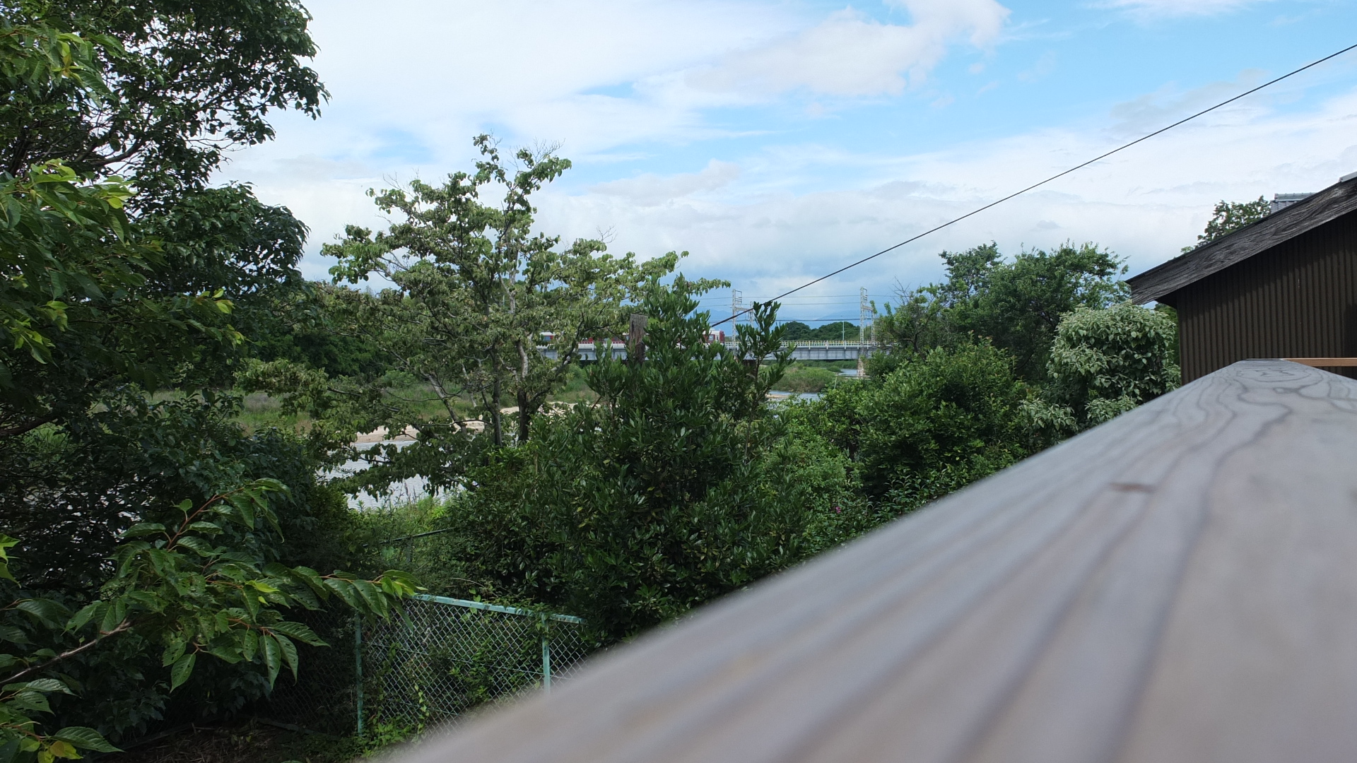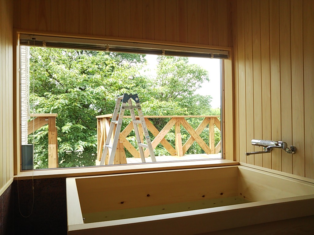 実際にお湯を張って入ったら開放的な眺望も相まって露天風呂のような気分が味わえることでしょう。青い空に映える新緑。遠方には鉄道の鉄橋が望め、そして目の前には脚立。誰だこんなところに置いたのは。
