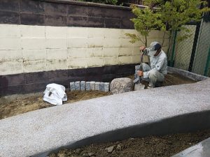 門からアプローチ周りの作業が完了しました。門から玄関ポーチへ至る通路をスロープ状とし、軽く湾曲させています。イメージとしては『遊歩道』。n様はお仕事が忙しい方ですが、裏庭のドッグランも合わせて植栽の手入れをお願いします。