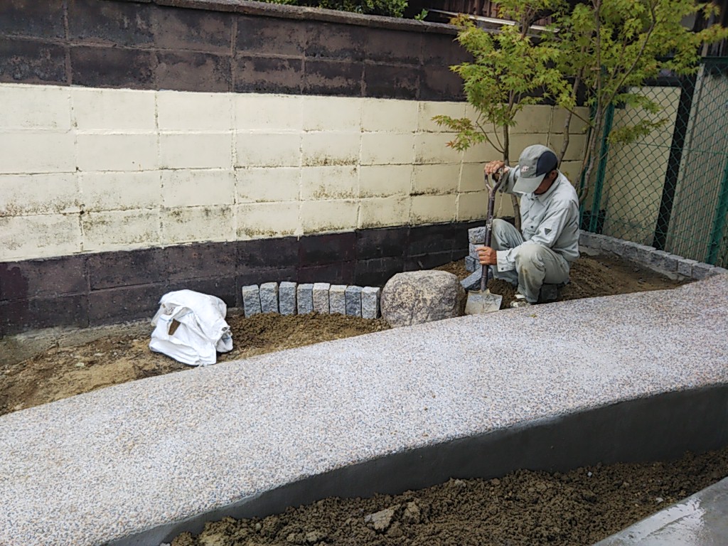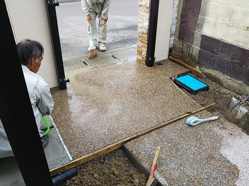 豆砂利洗出し仕上、モルタルの中に化粧豆砂利を混ぜて打設し、しばらく置いた後、文字通り水で洗って表面のモルタルを流し豆砂利を表す仕上です。出来上がると非常にきれいに見える事、比較的自由な形が造れる事で重宝する仕上方です。