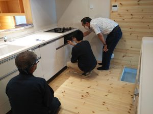 キッチンのガスなど試運転。『男子厨房に入らず』を地で行く(?‥想像ですが)三氏ならびに筆者。『このレバーはなんだ?』『食洗機とはどうやって使うのだ?』と四苦八苦しながら点検します。