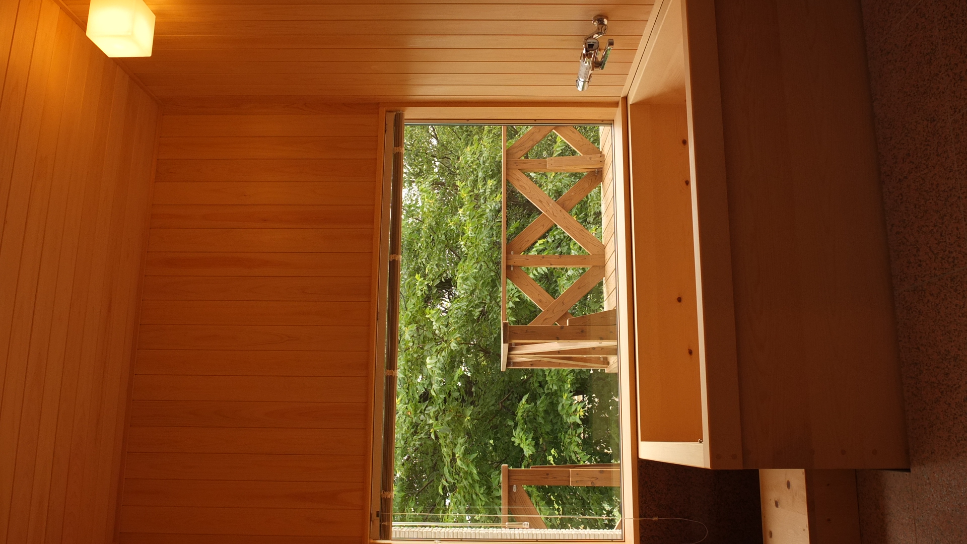 浴室の間口いっぱいに収まる開口のFIX窓を取付けました。こちらから景色は眺望できますが、反対側からは内部があまり見えないという特殊な立地から、透明ガラスをはめ込んでいます。湯船に浸かりながら時折鉄橋を走り抜けていく鉄道の窓から漏れる灯りを眺める。N様のご希望です。