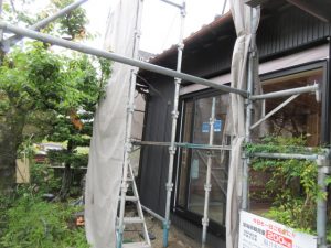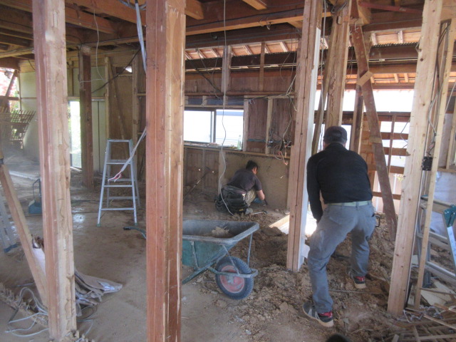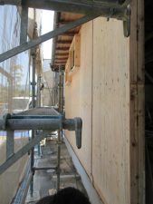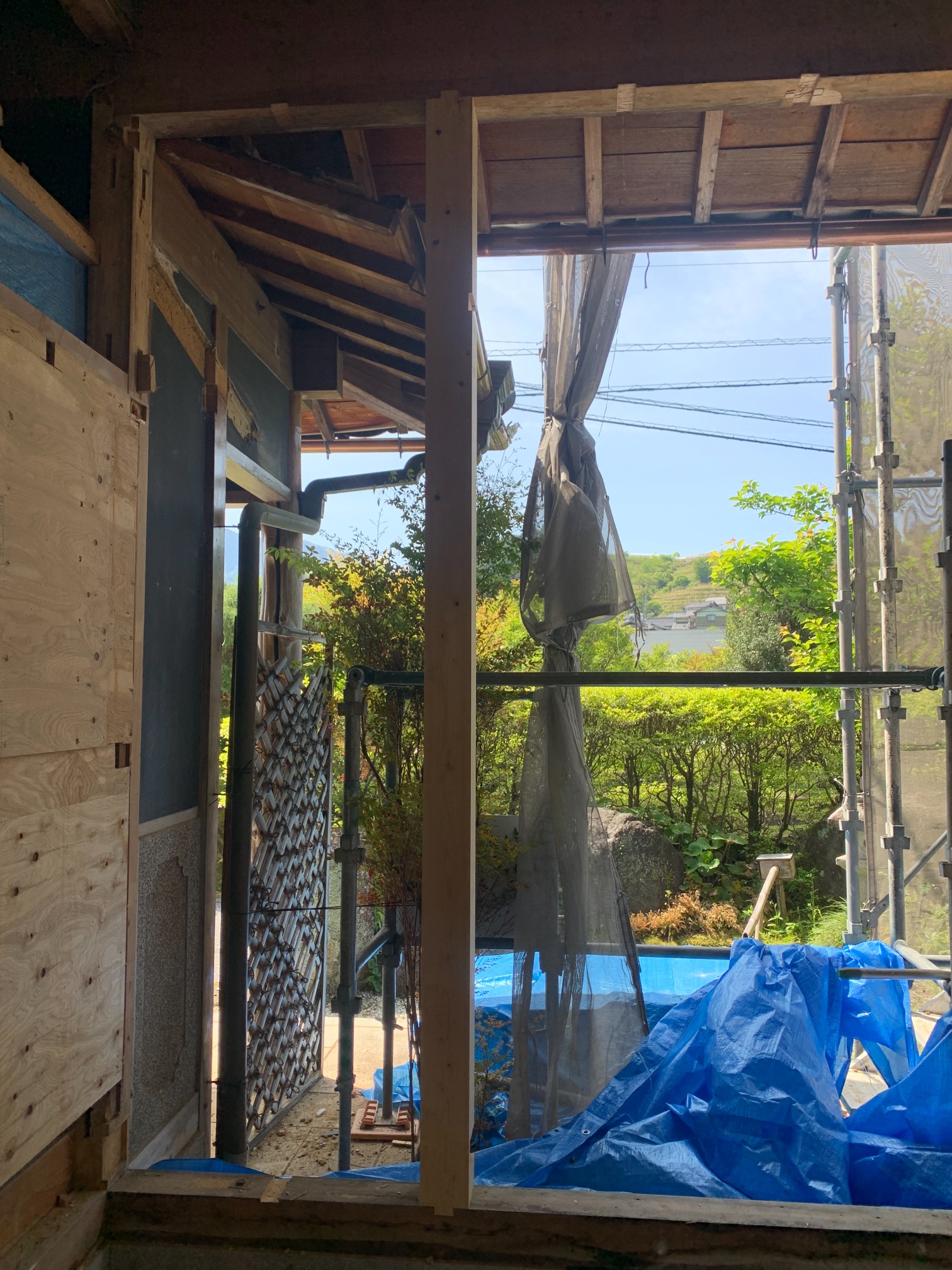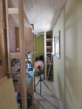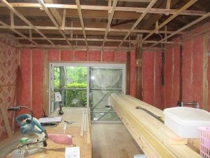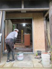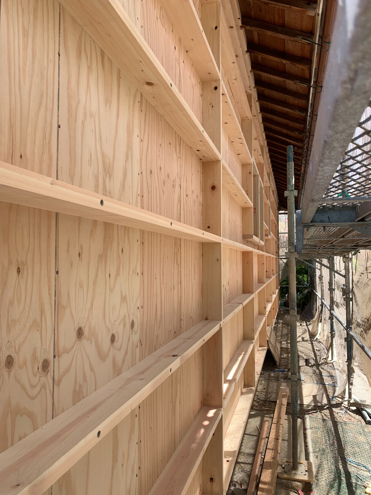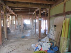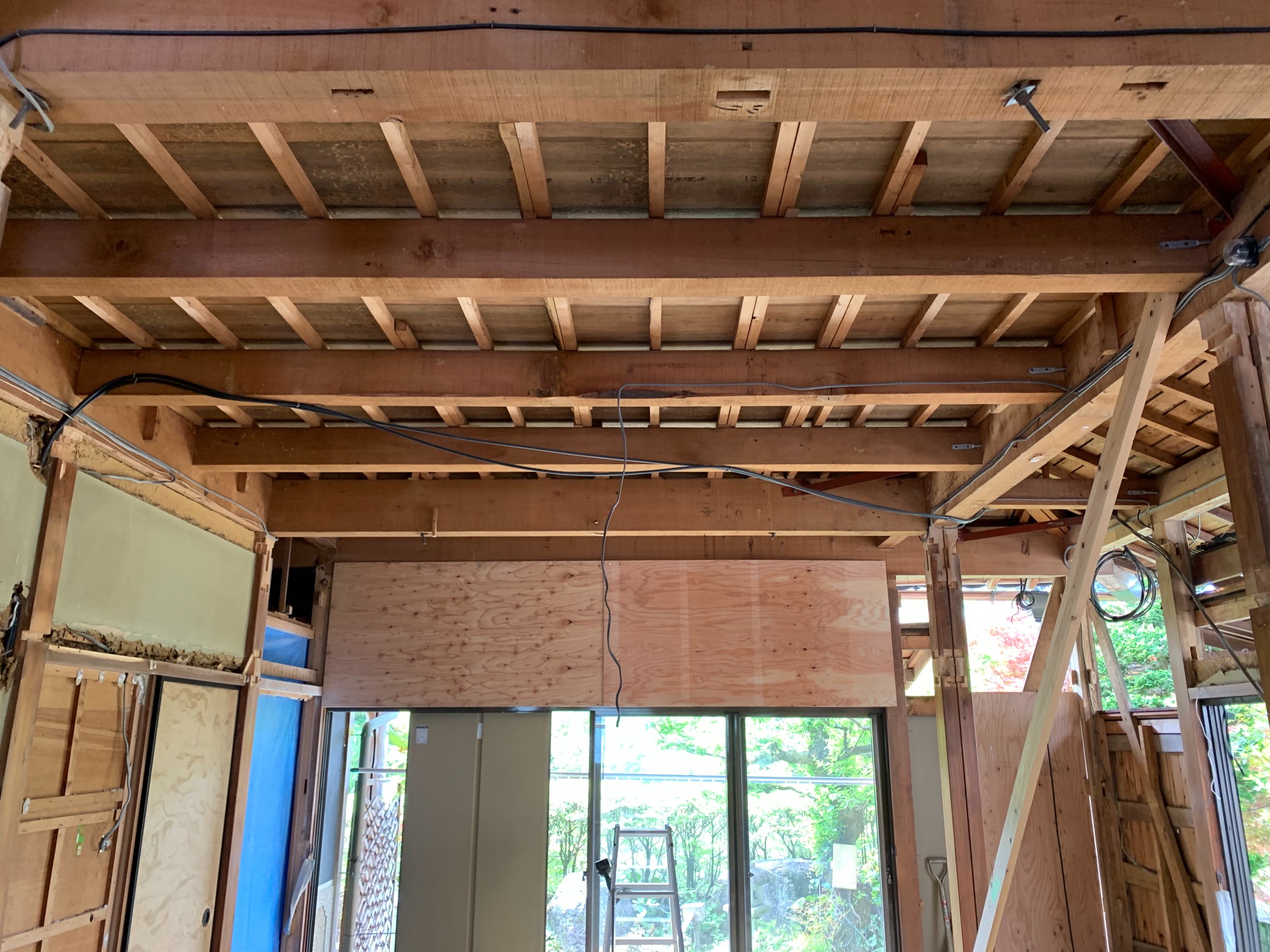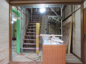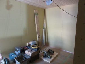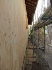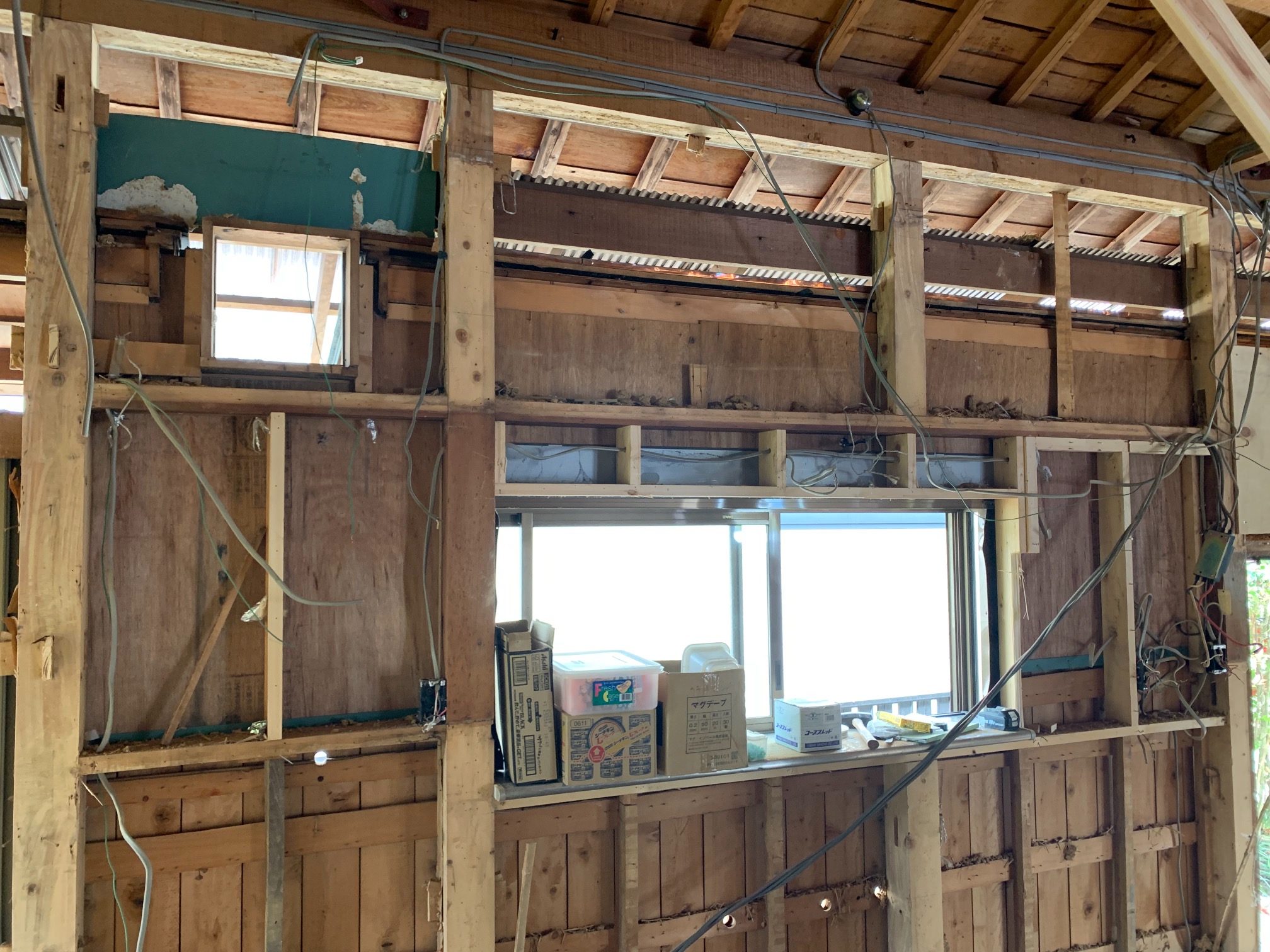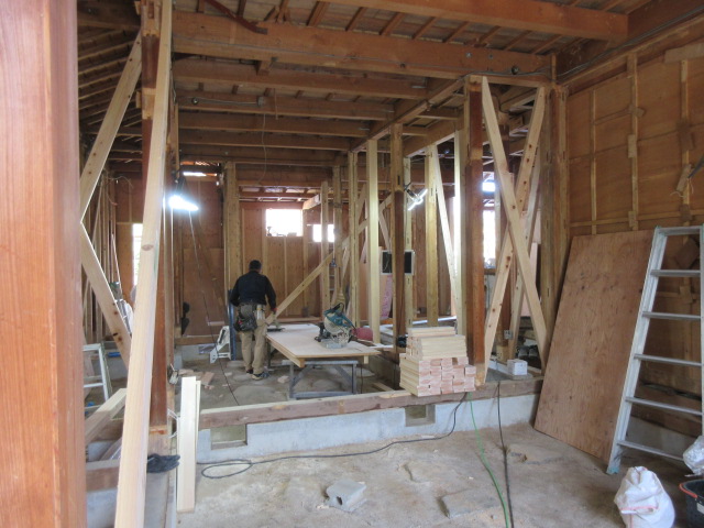 連休前5月2日の様子です。今回は家全体の耐震改修とまではいきませんが、やれる範囲内で補強も行っています。耐力壁(筋交い・構造用合板)を取り付けています。