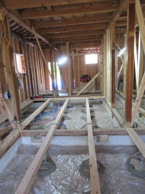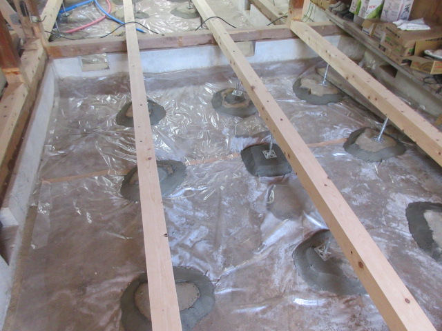 内部は、床下の環境はよいですが、せっかくなので防湿シートを敷き詰め、大引きを設置。