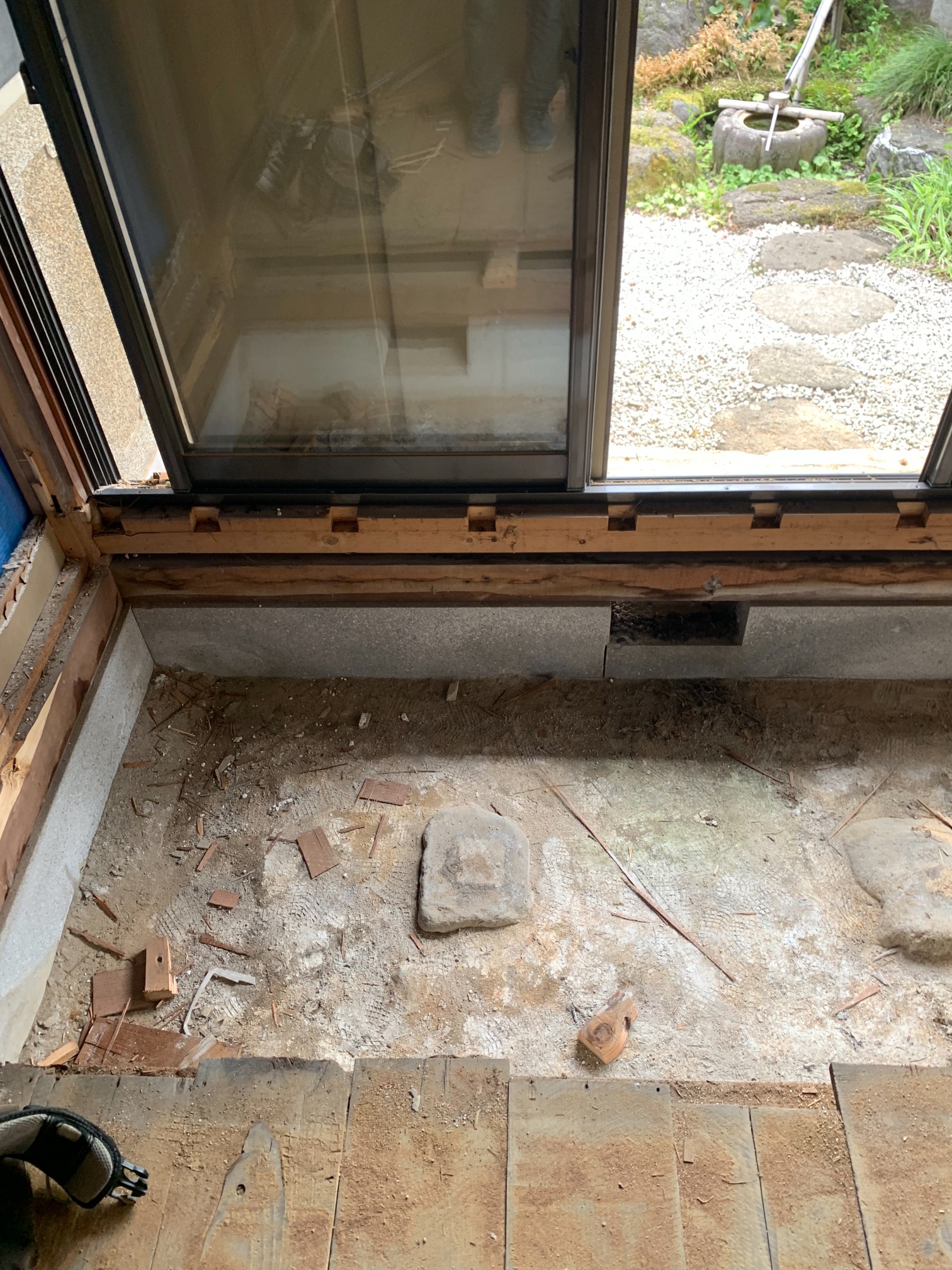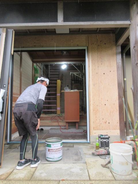 昨日は、ミノワ基礎部隊のt広さんが、取り換えた玄関引戸の下枠処理に来ました。