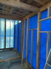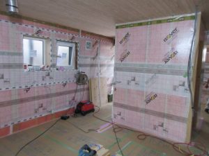 外廻りは、サッシが取り付けられて、通気胴縁、外壁用下地も終了しています。あとは板金屋さん待ちです。