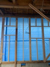 内部は、調湿気密シートが施されました。あれ~?断熱材がない~💦先日、断熱材を入れてから気密シートを張ります~と書きましたが、グラスウールでも今回は吹込みタイプだったそうです。ごめんなさい💦吹込みタイプは、気密シートを施してから、吹込んでいきます。