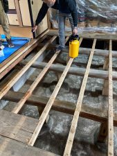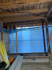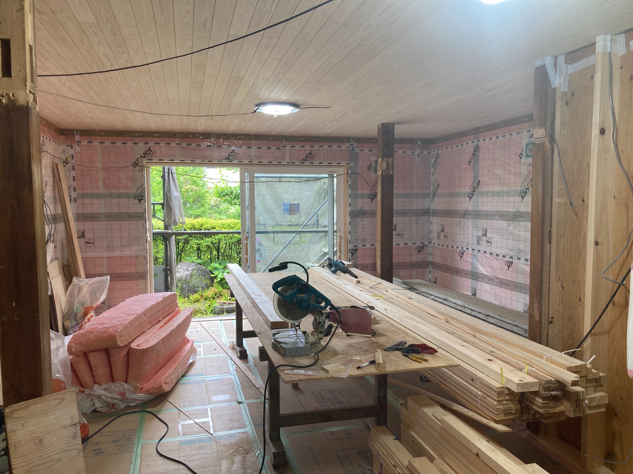内部は、床の合板が張られて、壁の充填断熱を施しました。外壁面には高性能グラスウール、内壁面は既設が真壁の為厚みが薄くても高い断熱効果を発揮するフェノール樹脂の断熱材を入れています。いずれの素材も、燃えにくい素材で、万が一の場合にも有毒ガスの発生も少なく安心です👍