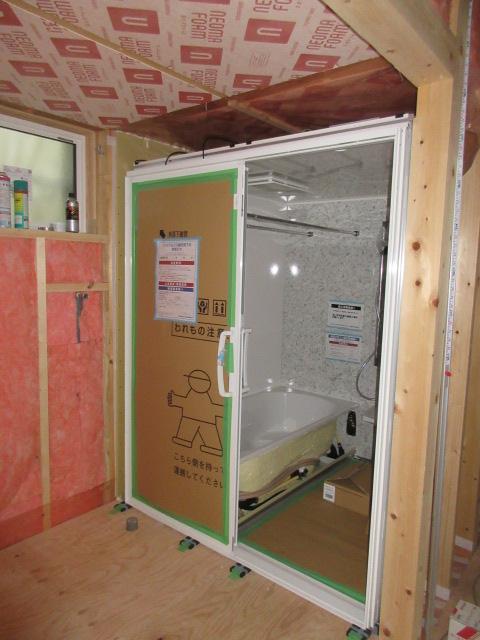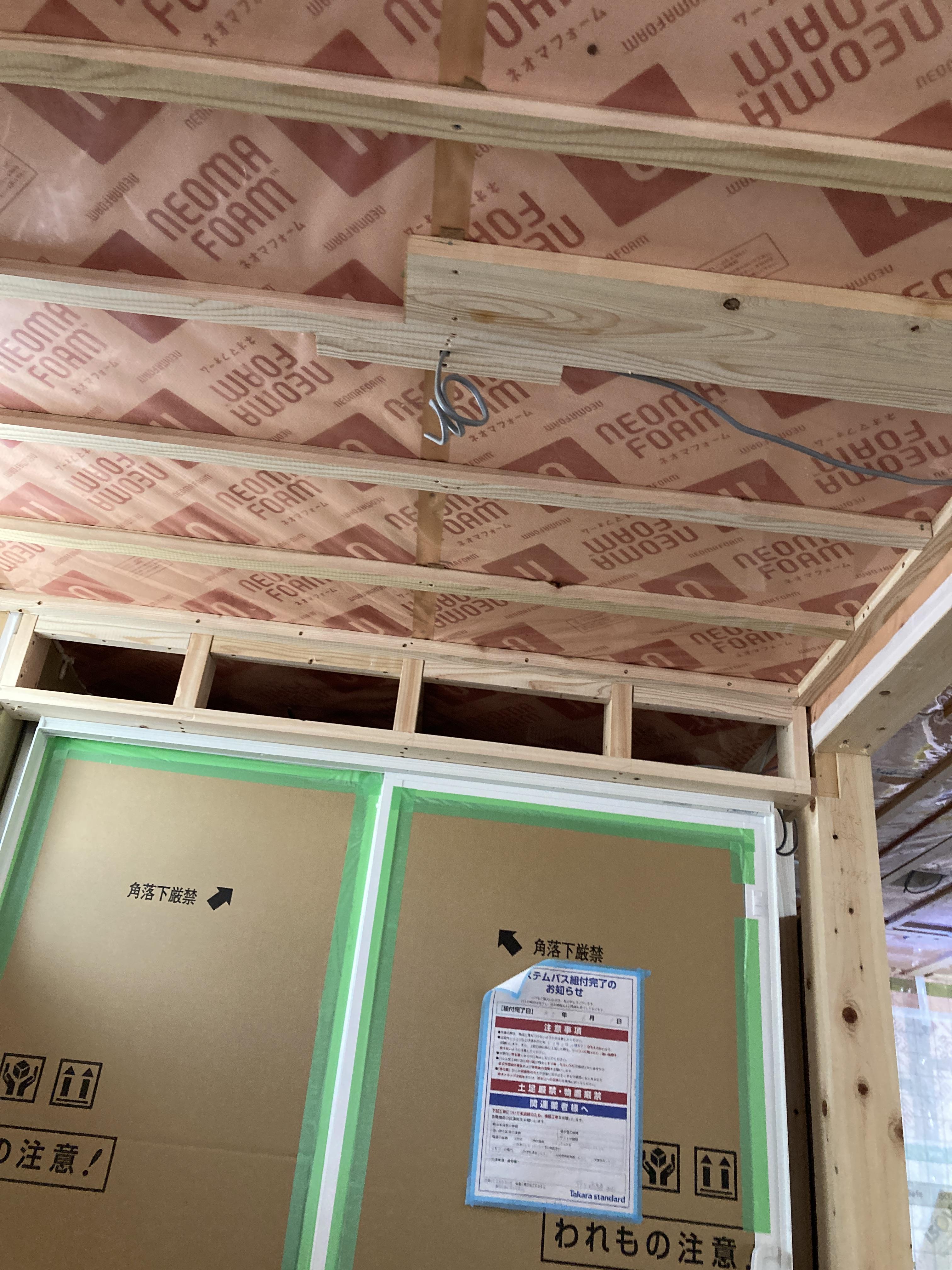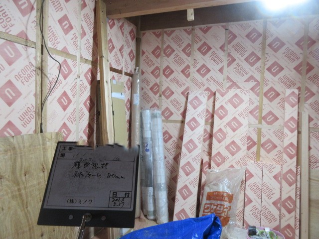説明をし忘れました。ユニットバスと脱衣室の天井断熱は、差し掛けの屋根の為、屋根と天井の間の空間が狭いので、壁と同じくフェノール樹脂を使用しています。