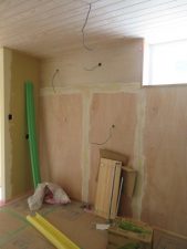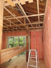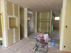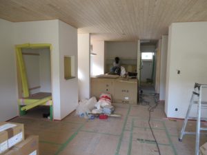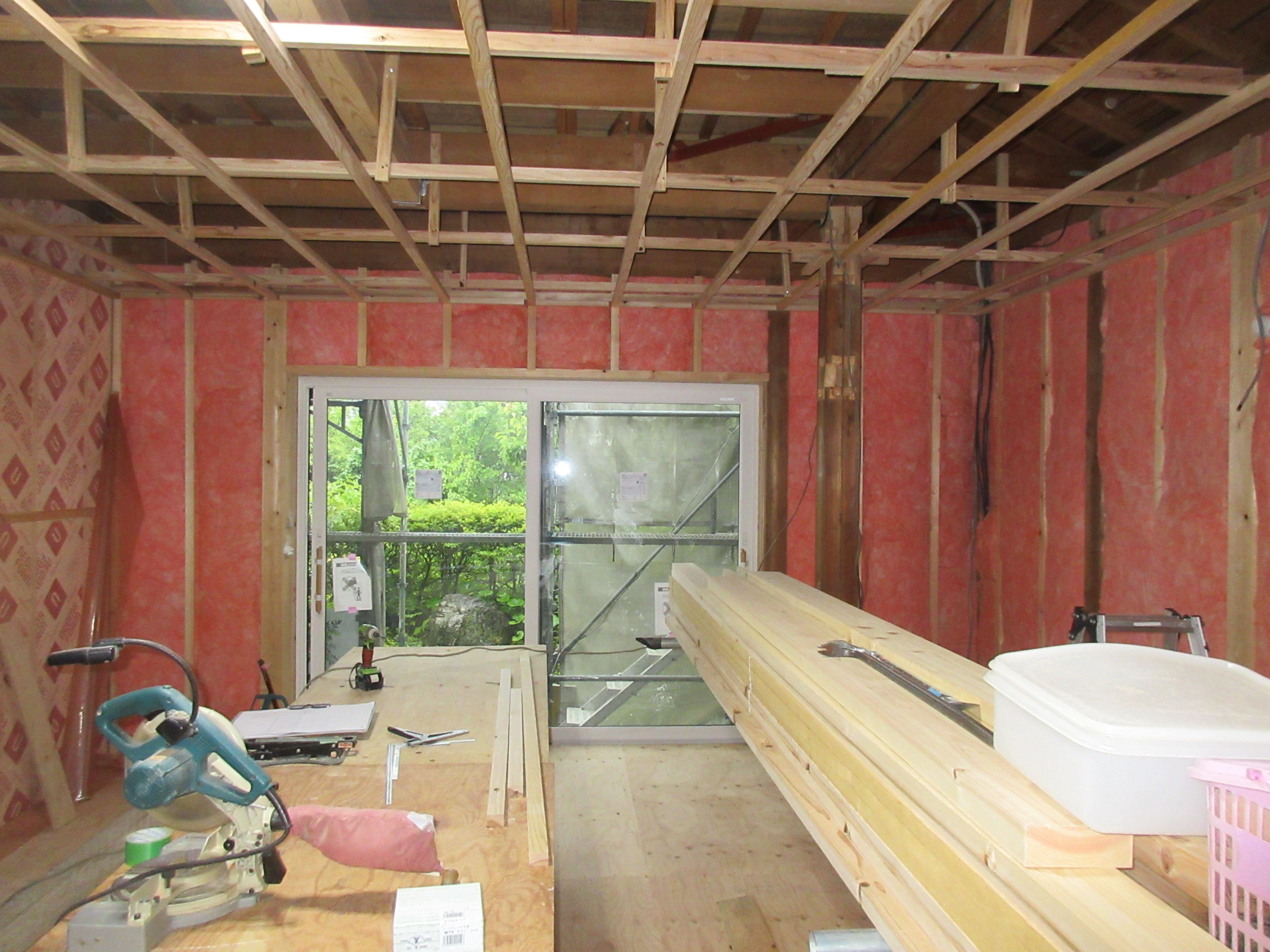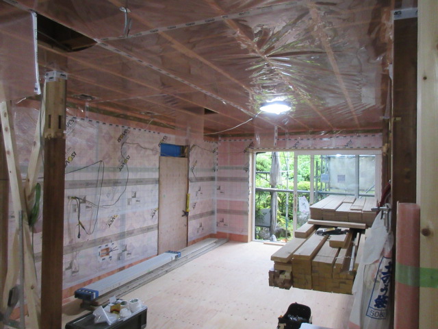 LDKは天井の杉羽目板を張り終えています。間仕切りの下地もところどころ見えなくなってきて、部屋の広さがわかるようになってきました。北側に水廻りと勝手口を計画しており、今回はトイレに窓が設けれませんが、トイレを中心に回廊できる間取りになっています。トイレの音がLDKに響かない防音用に、断熱材を入れています。
