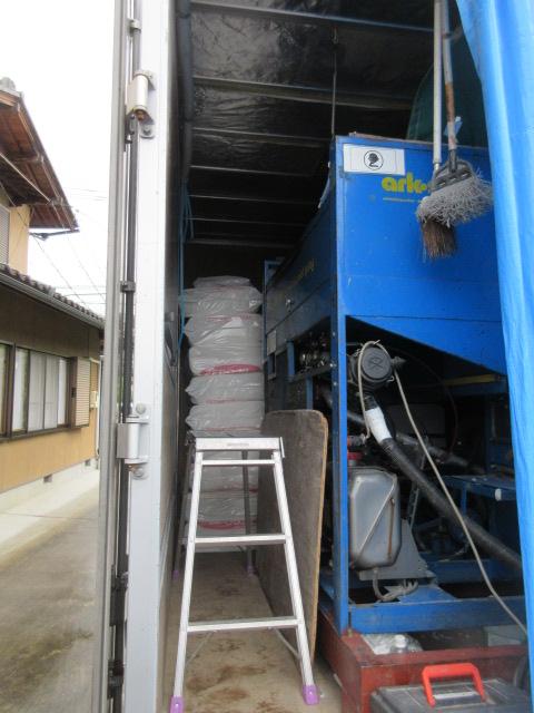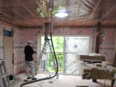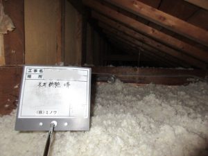 吹込みは専用の業者さんがやってきて、このように所々吹込み口を設けてあるのでそこから吹込んでいきます。天井裏は、このようになっています。雪が積もったような感じですね。