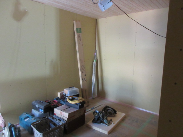 造作棚等の取付が完了し、壁のプラスターボード張りが行われています。