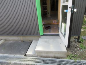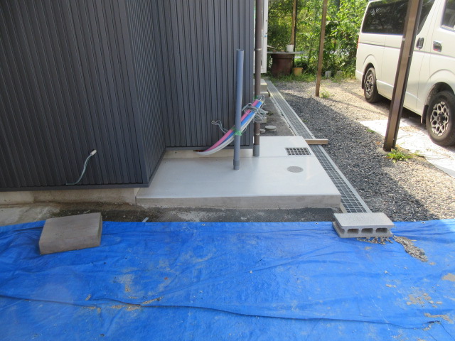 外回りのコンクリート土間が仕上がりました。給湯器を置くスペースと新しい勝手口の階段です。