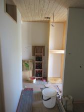 玄関ホールの壁板張り工事もほぼ完了しています。