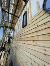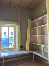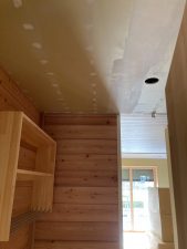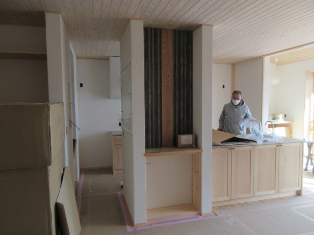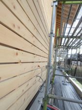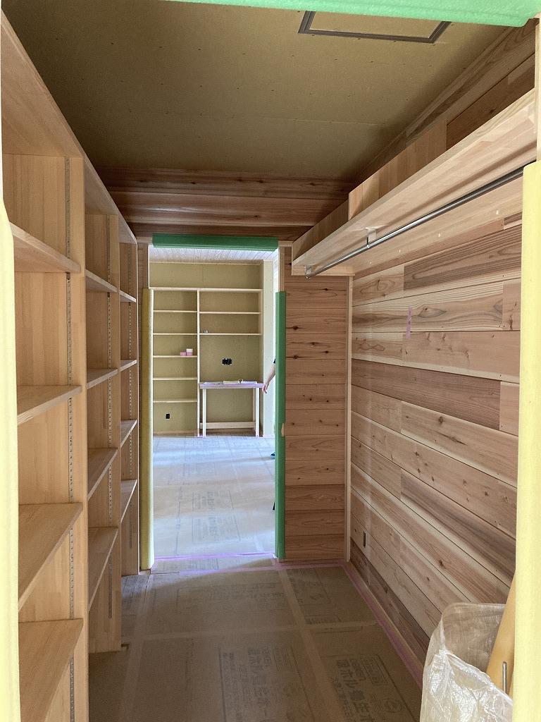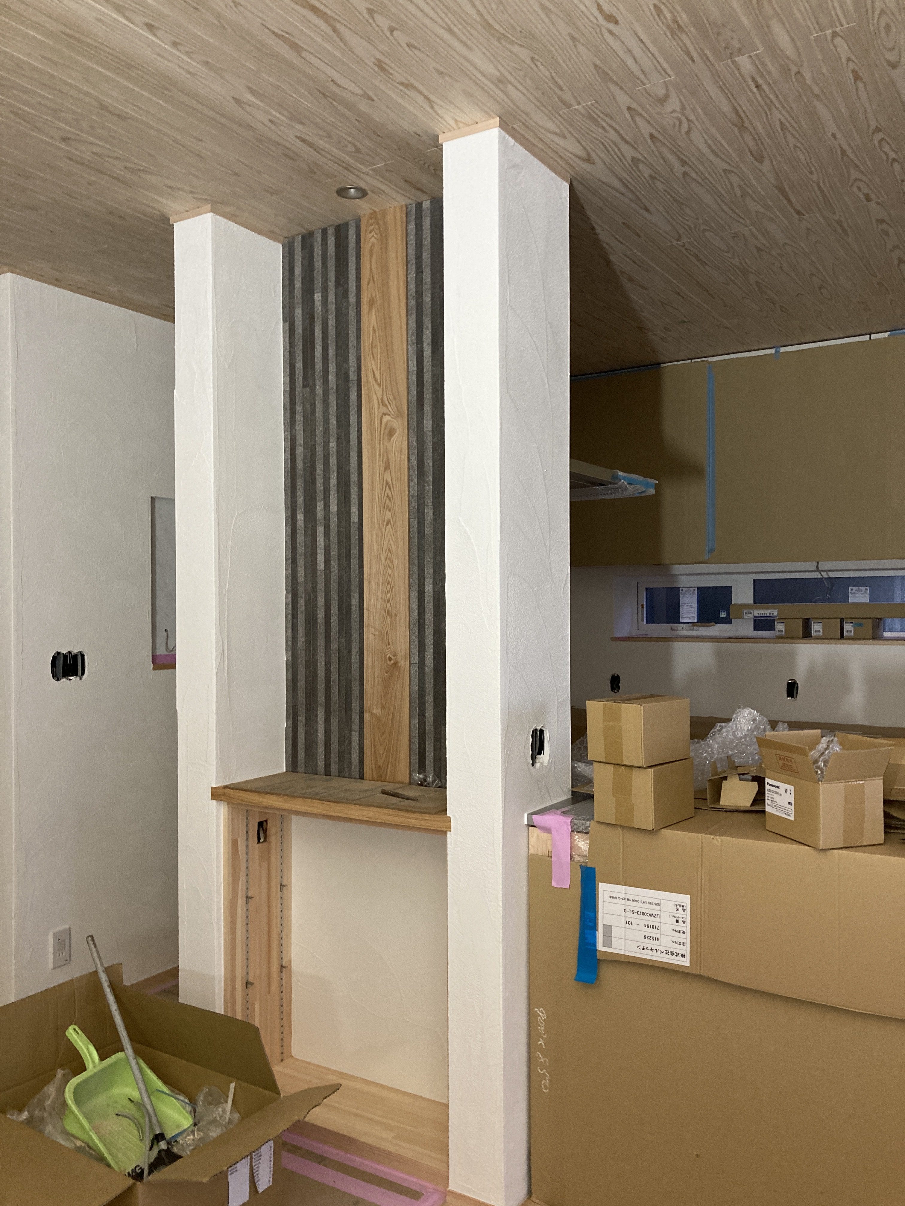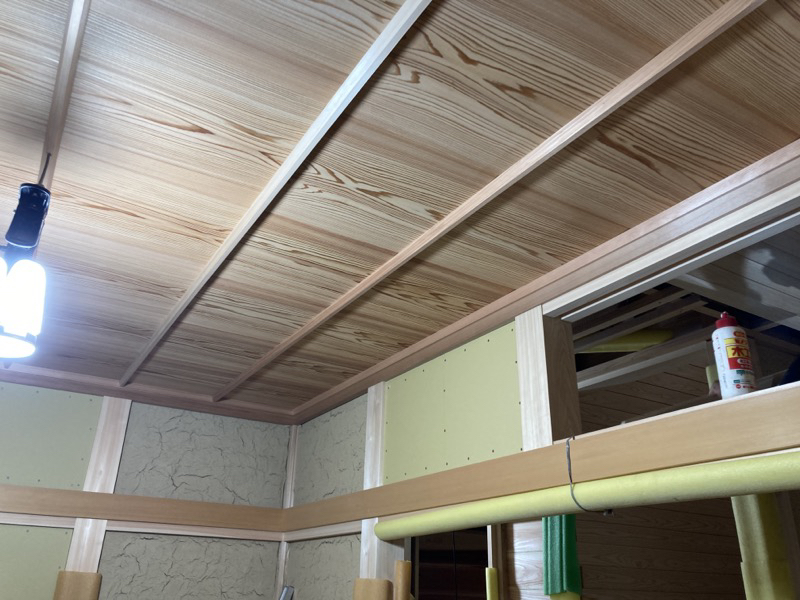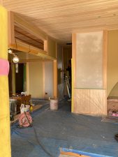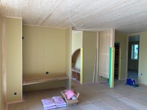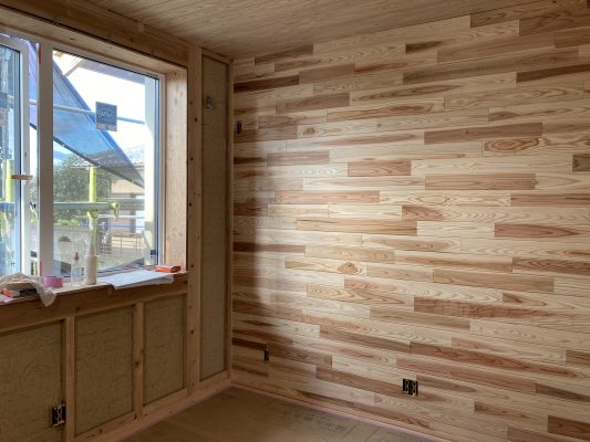 お子様のrちゃんのお部屋の杉羽目板張りの壁が良い感じに出来ていました。窓側の壁は漆喰の白色になりますのでもっとアクセント感が出ると思います。仕上がりが楽しみです。