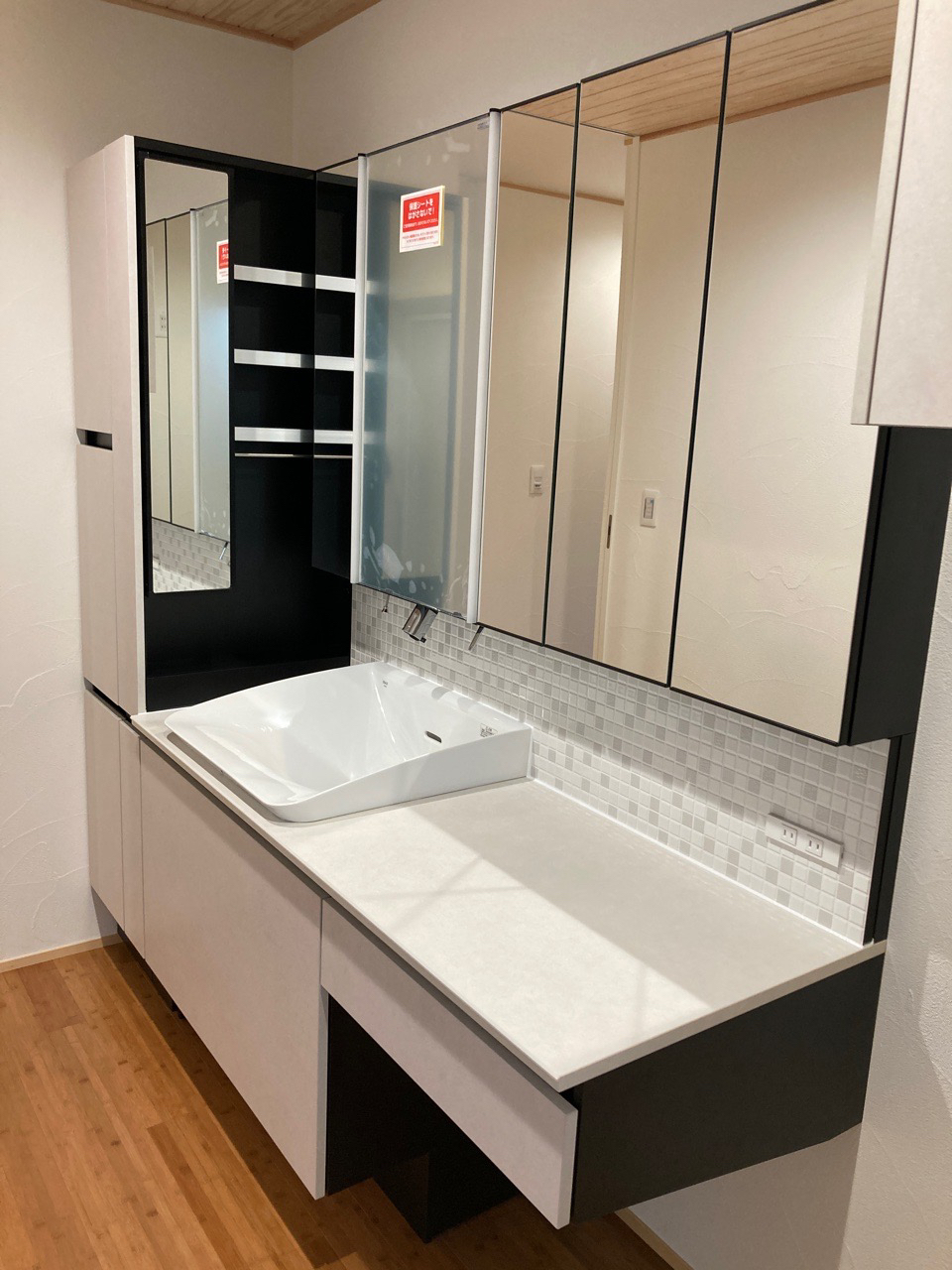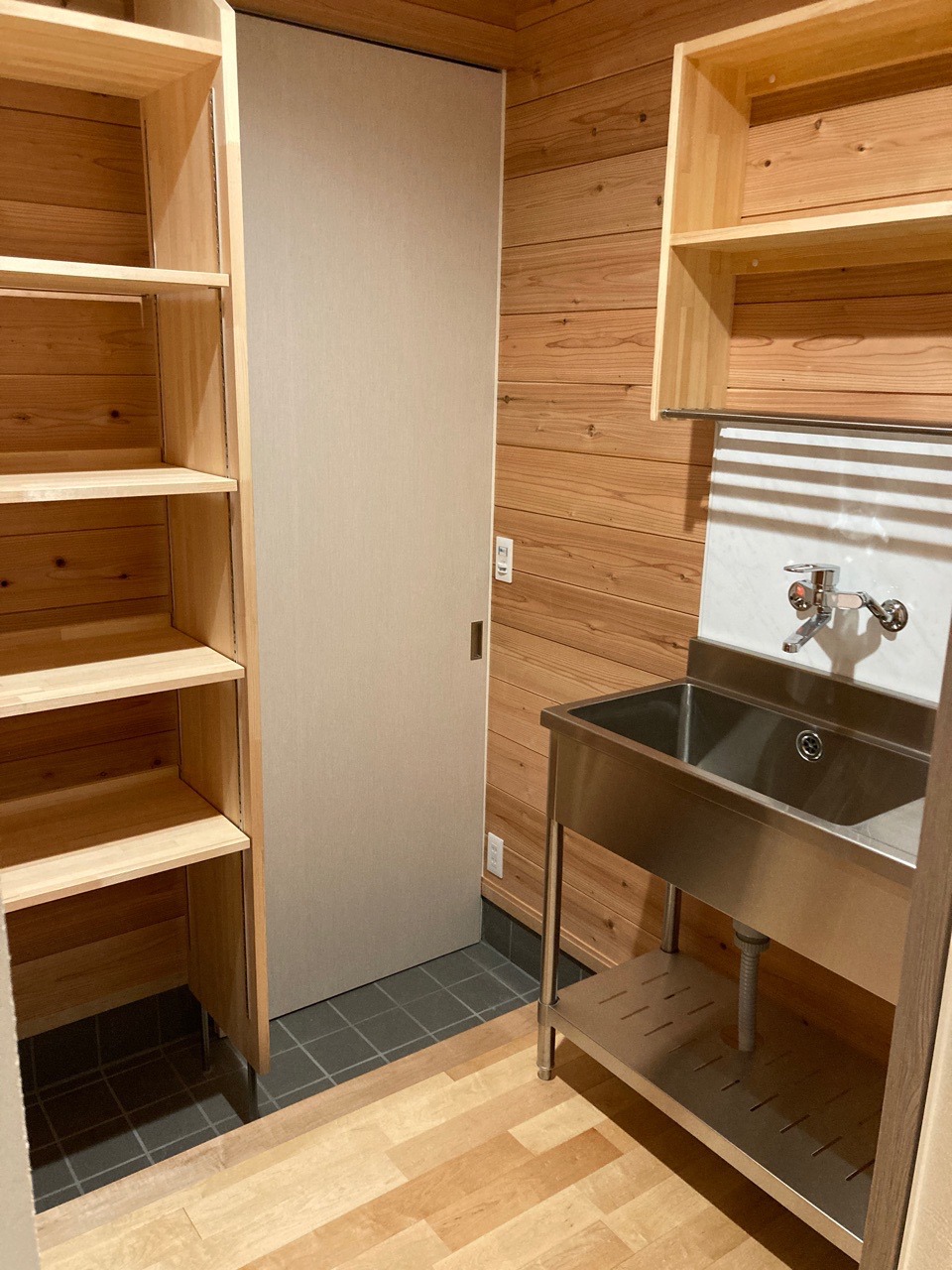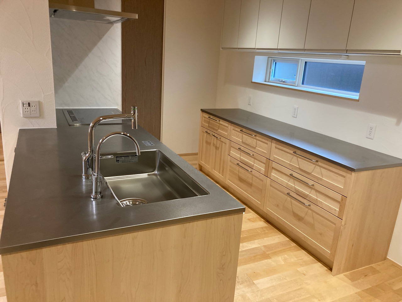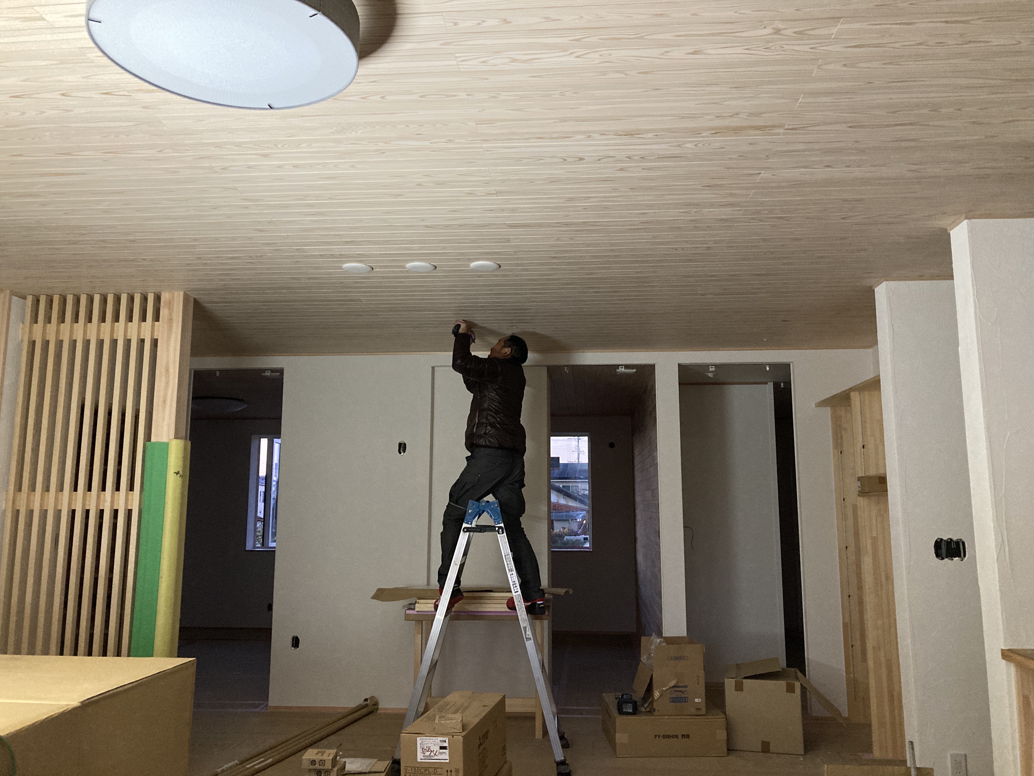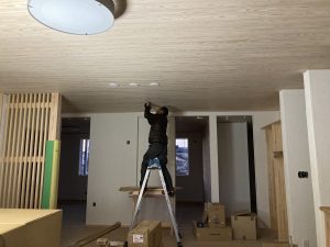 来月お引渡しを控えたこちらの現場は照明やキッチンが取り付けられています。a様が選ばれたのはウッドワンの(su:iji)スイージーです。扉や引き出しが無垢材で造られておりますが、特殊な塗膜が塗られているため汚れも取れやすいそうです。同じメープル材が張られているリビングの床と共に使い込むことで経年変化が楽しめます。