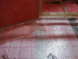 小屋裏の断熱材を施工後、調湿気密シートを貼り気密性を高めます。