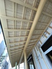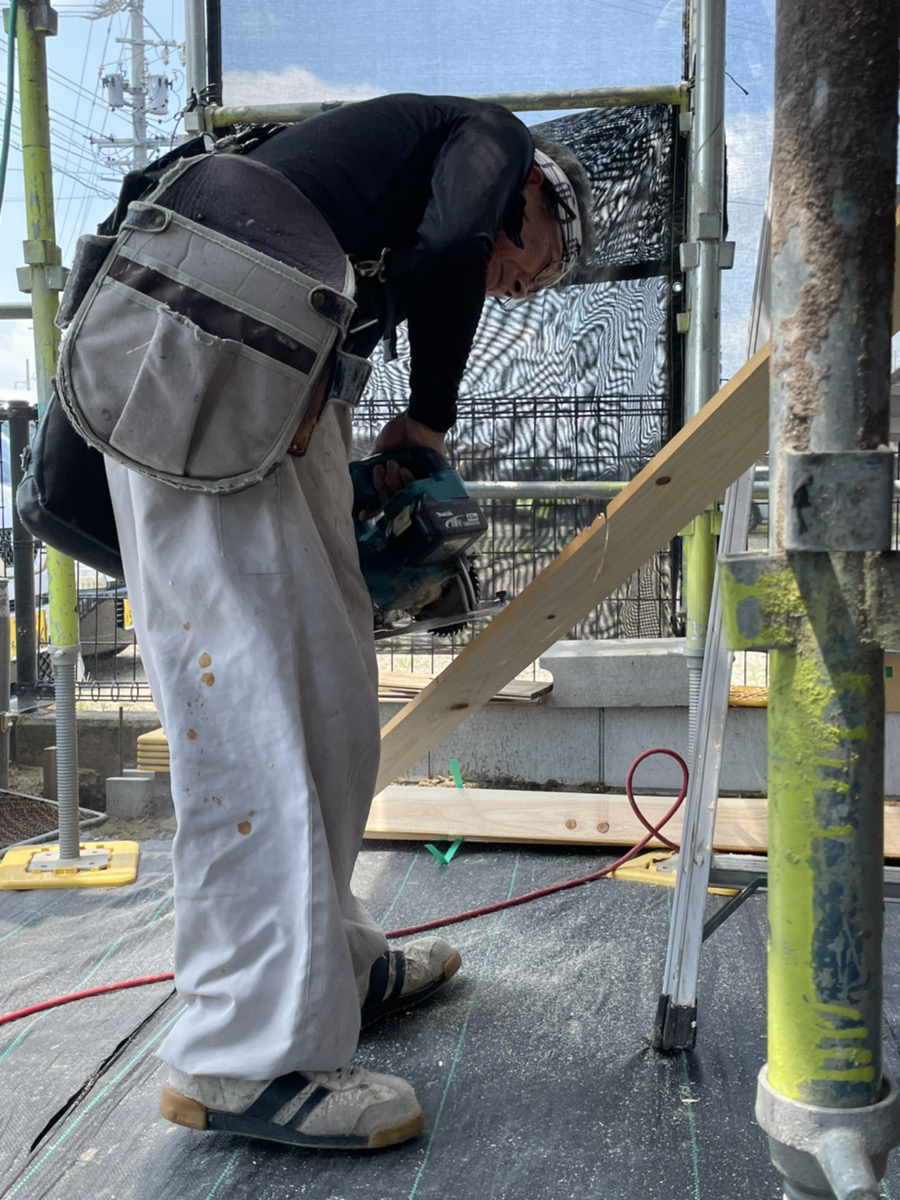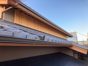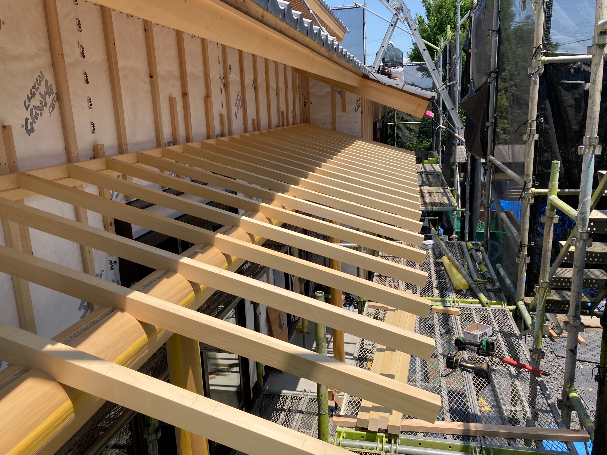 軒裏がサイディングなどで隠れてしまう場合は垂木の上に合板を張りますが、こちらの現場は化粧板の軒裏仕様なので、その部分は小舞→杉板を張っていきます。手間も時間もかかりますが細かいピッチで入れていく小舞と化粧板は和風の美しい仕上がりになります。