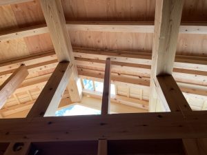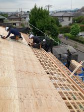 母屋に垂木が架けられ、野地板が敷かれていきます。