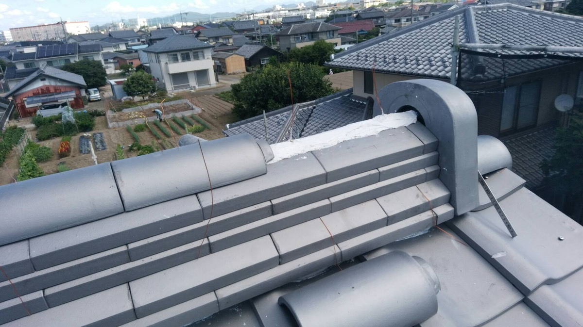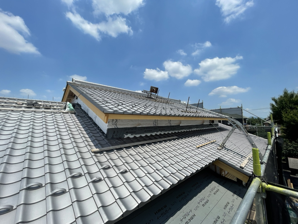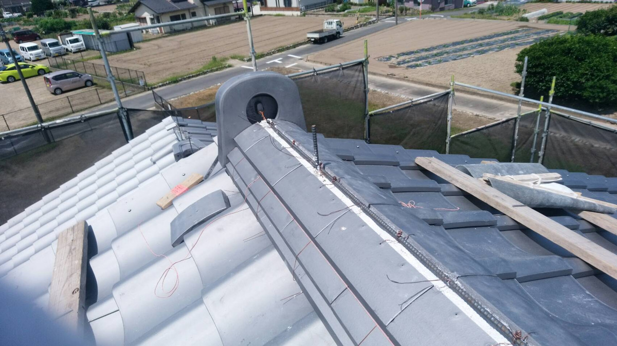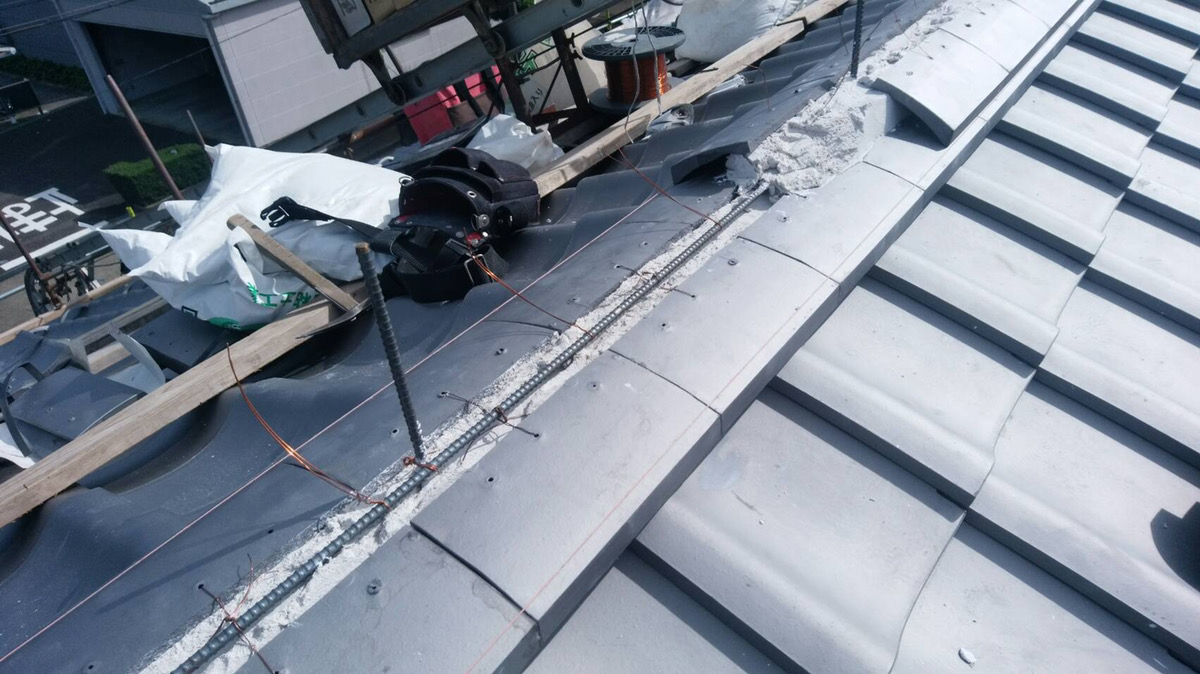 屋根は棟瓦が進んでいます。建物に固定された金具に鉄筋を横に流しています。その鉄筋に銅線をくくりつけ、のし瓦、棟瓦に巻き付け土と共に固定します。一枚づつ手作業で時間も手間もかかりますが、今回瓦を施工していただいているk嶋屋さんは、このような耐震工法による施工を見てもらい、お客様に安心して瓦を使っていただきたい。と画像を残してくださいました。