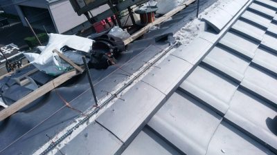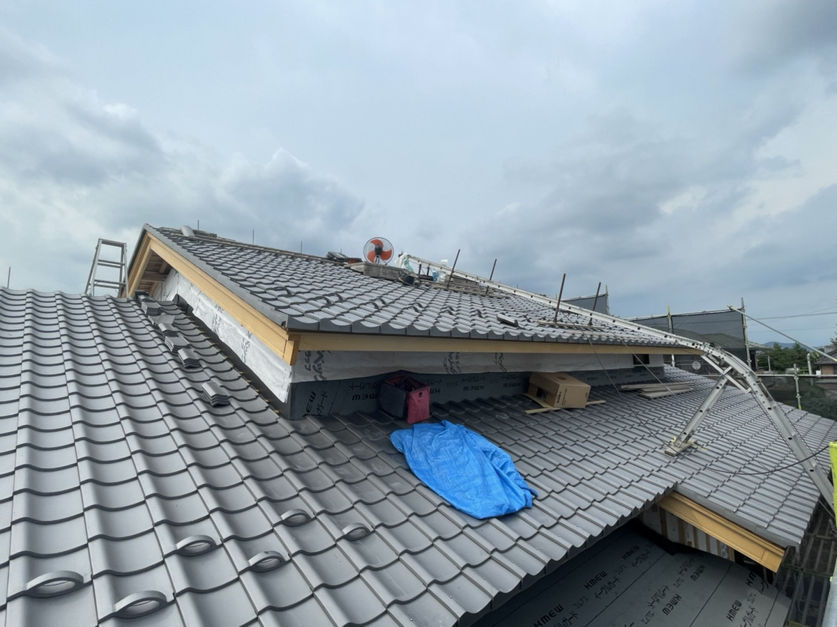 屋根瓦が葺かれています。曇り空なので作業はしやすそうですが、ちょっと雷が心配です。