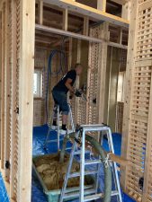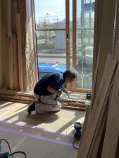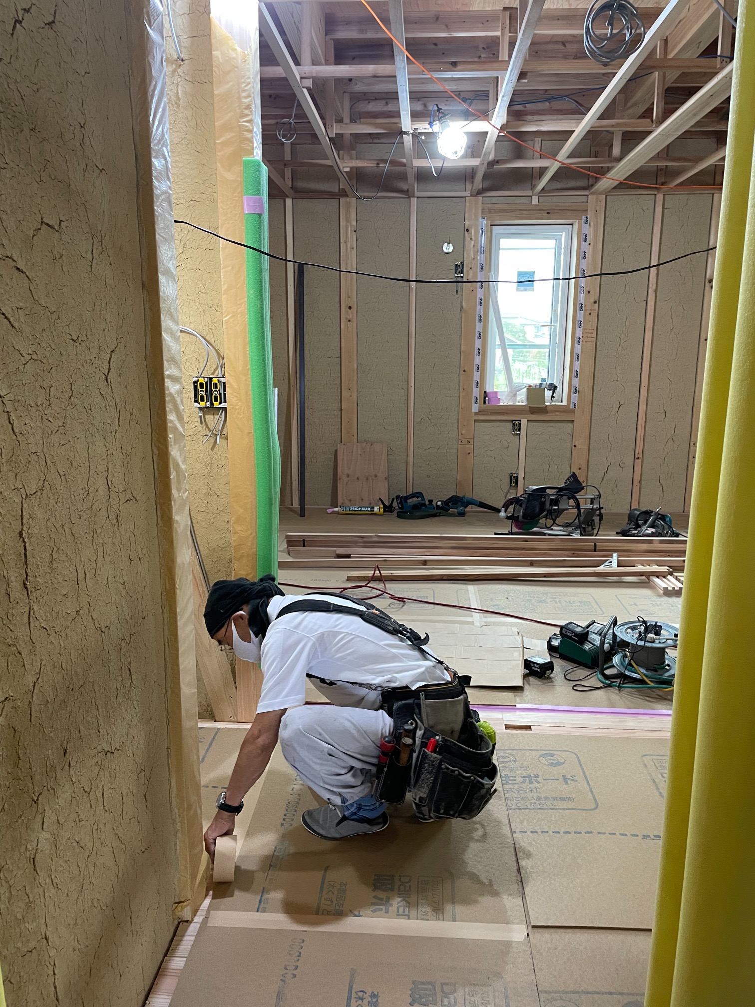 今日は新人のo本監督が床下掃除を行っています。施工中に出た木くずや釘などがない様、しっかりチェックしていきます。。