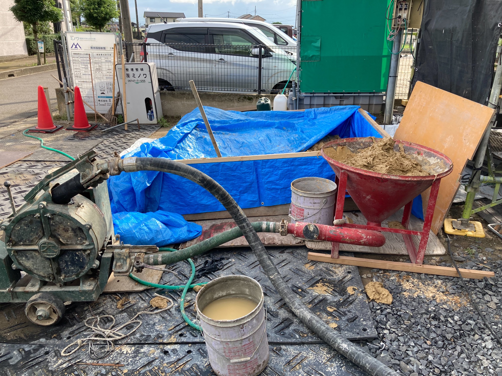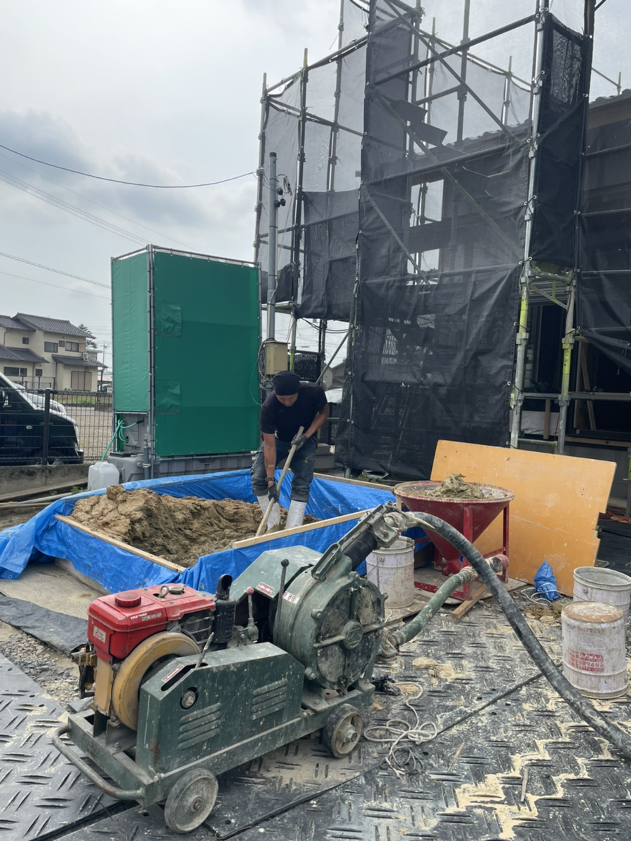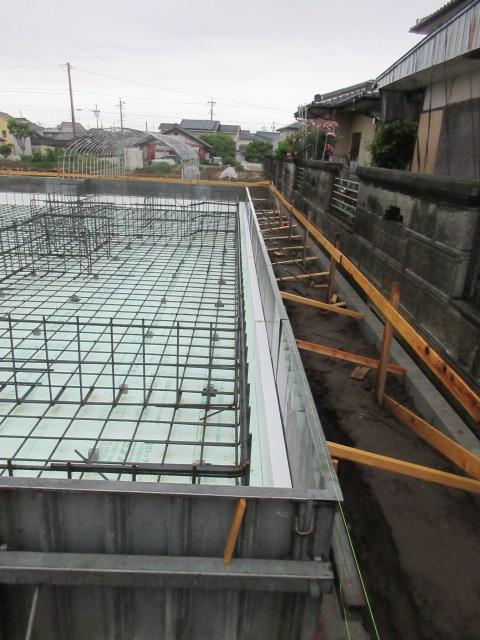 内・外側に断熱材を施した後、基礎の生コンが流し入れられました。