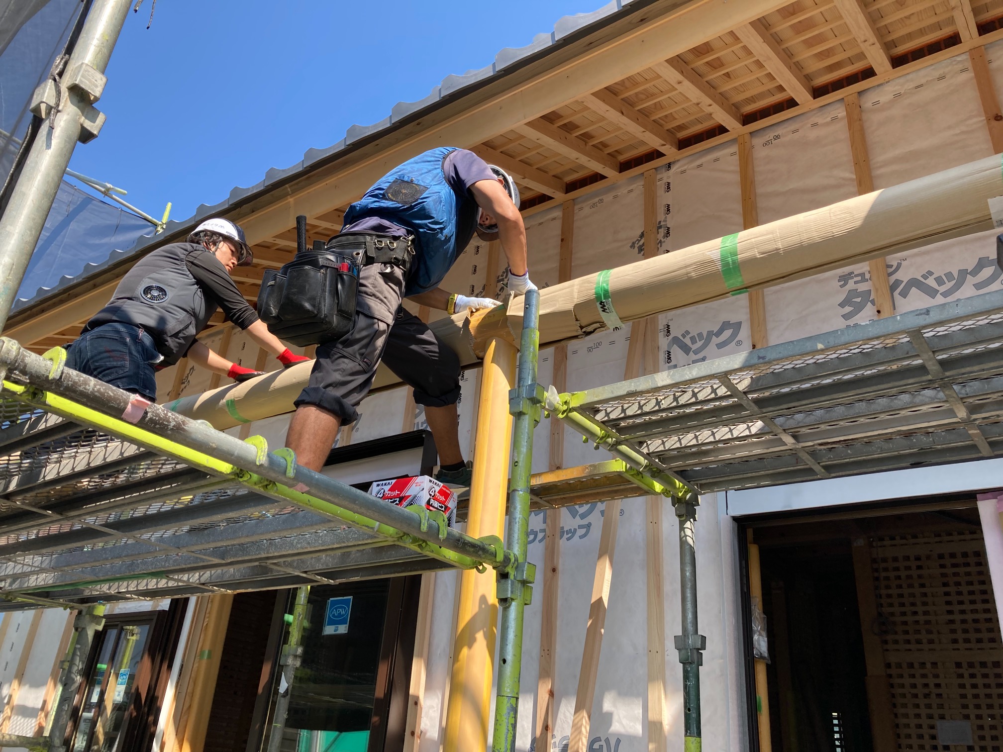 今日は5人の大工さんにより急ピッチで進んでいます。外部は付加断熱(高性能グラスウールt₌105)用の下地取付が進んでいます。