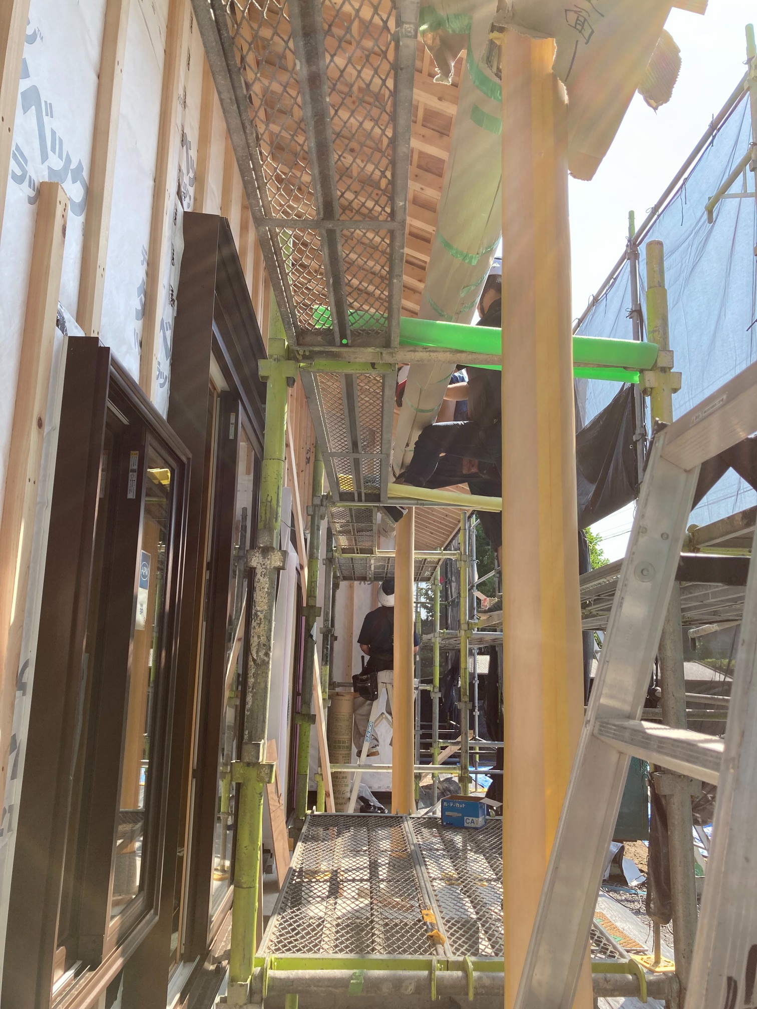 重厚感のある玄関庇です。丸太桁の上には化粧板も張られました。w邉大工さんは外壁の下地作業中です。