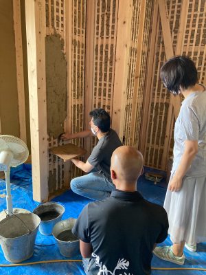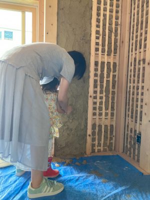 土壁は残り5枚で完了です。土と木材がよく乾いてから大工さんの造作に入ります。造作後にはまた土壁塗り(今度は中塗り。ワラの細かさや材料が少し違います)を行います。この日の2日前にはa 様ご家族も土壁塗りを体験されました。見えなくなってしまう荒壁ですが、家づくりの思い出の一つにしていただけたらと思います。