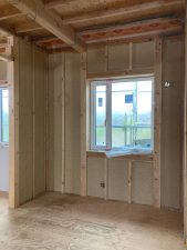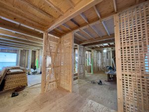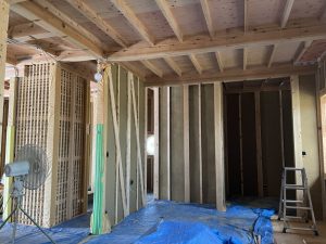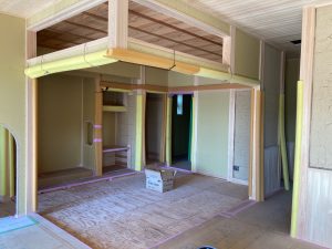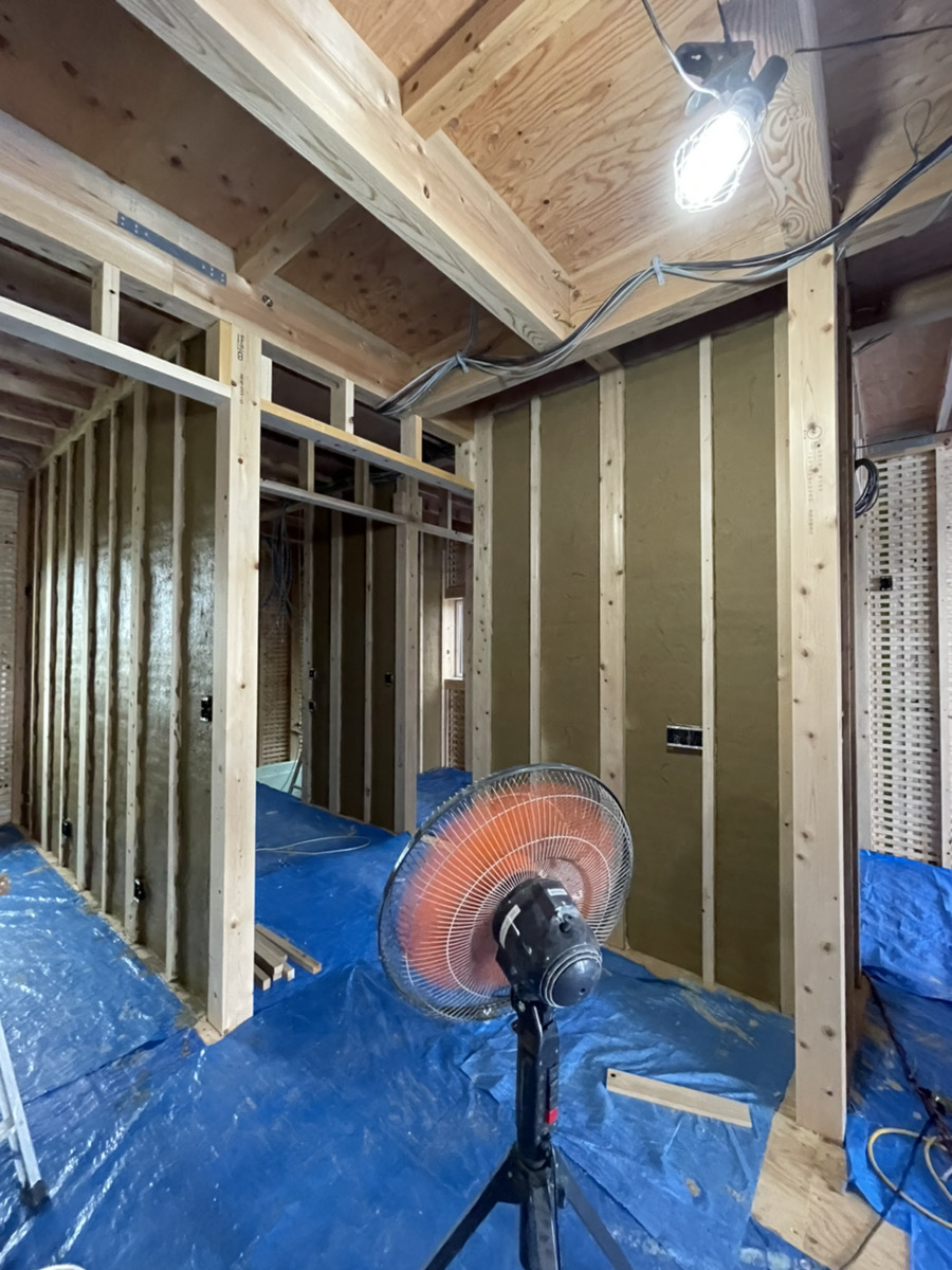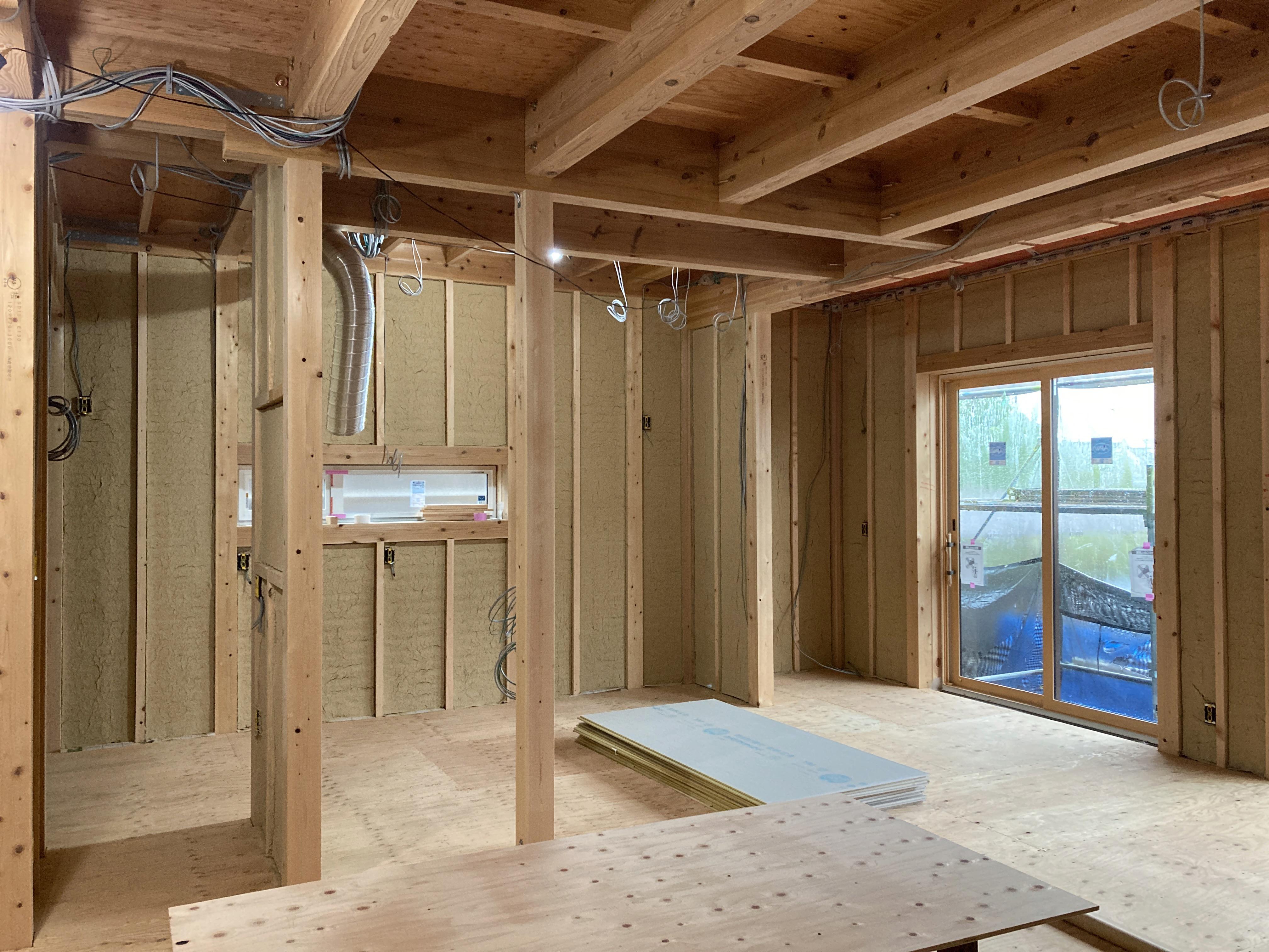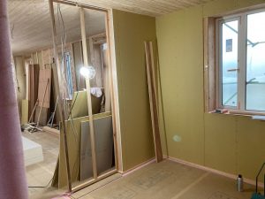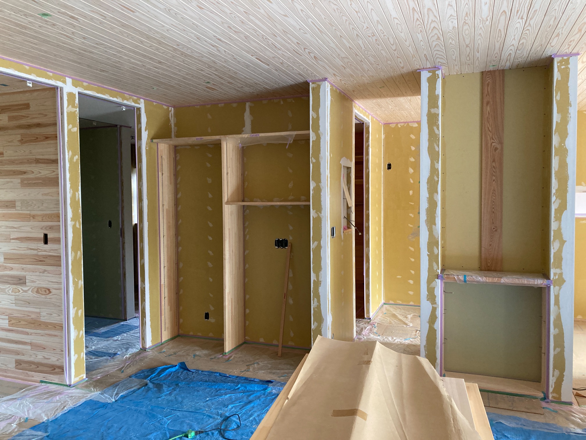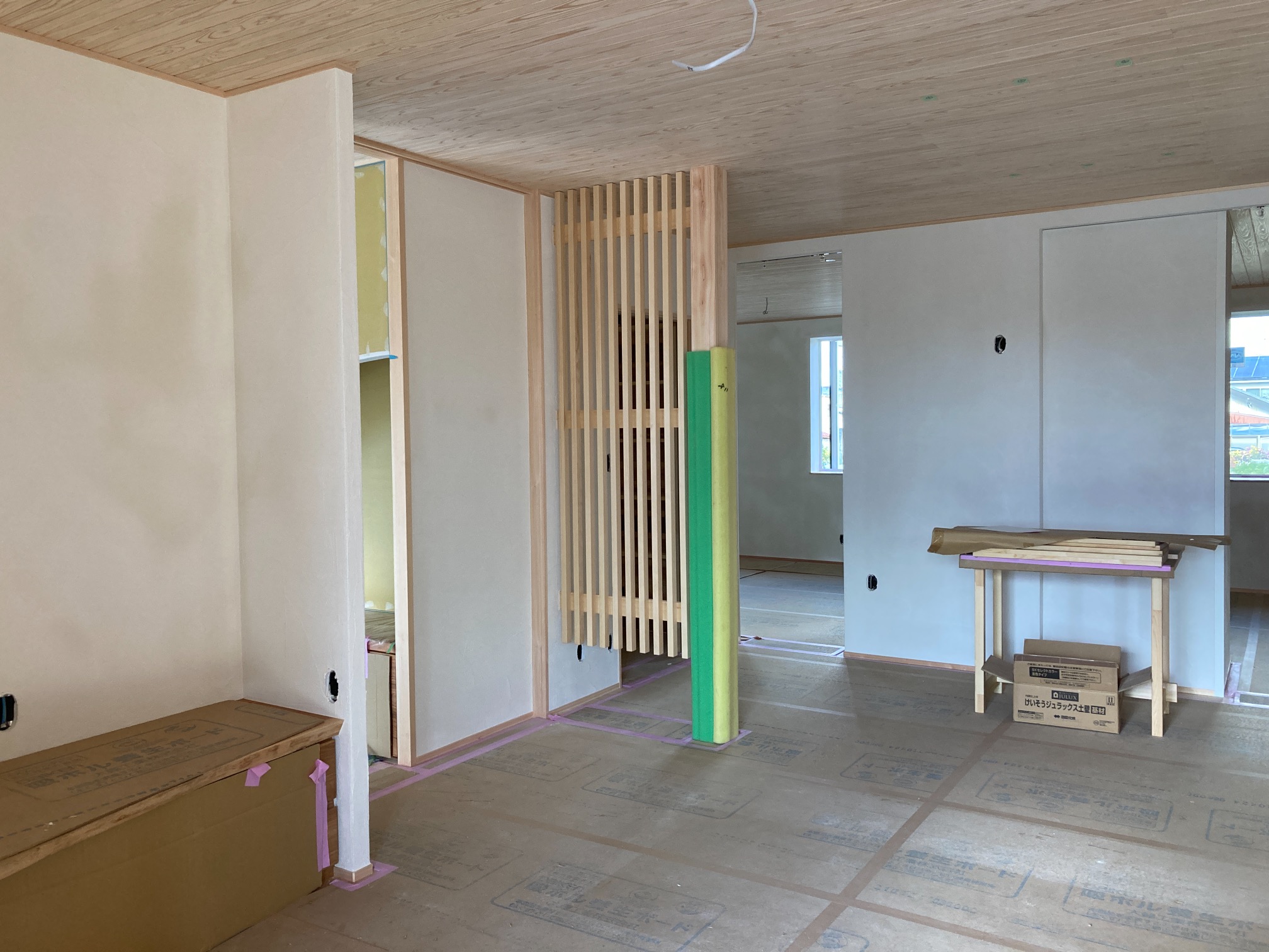 内部は大壁部分にはプラスターボードが貼られています。真壁は仕上げ前の中塗り待ちです。