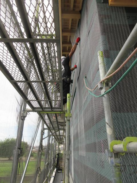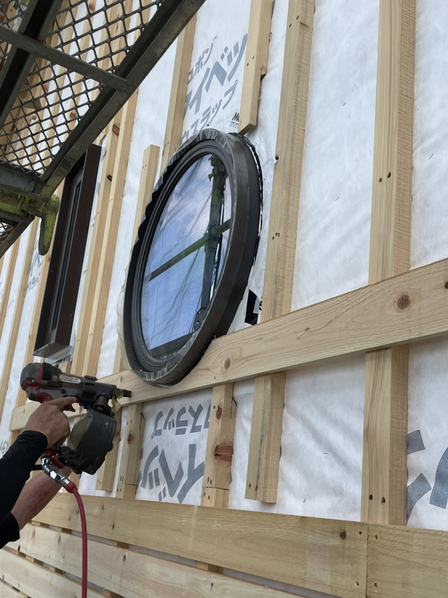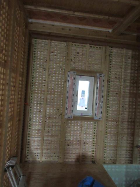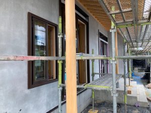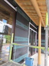 外部は塗壁のラス下地→防水紙→ラス網張りが完了しました。この後モルタル塗られ、仕上げは紫外線や雨に強いジョリパッド吹付の予定です。