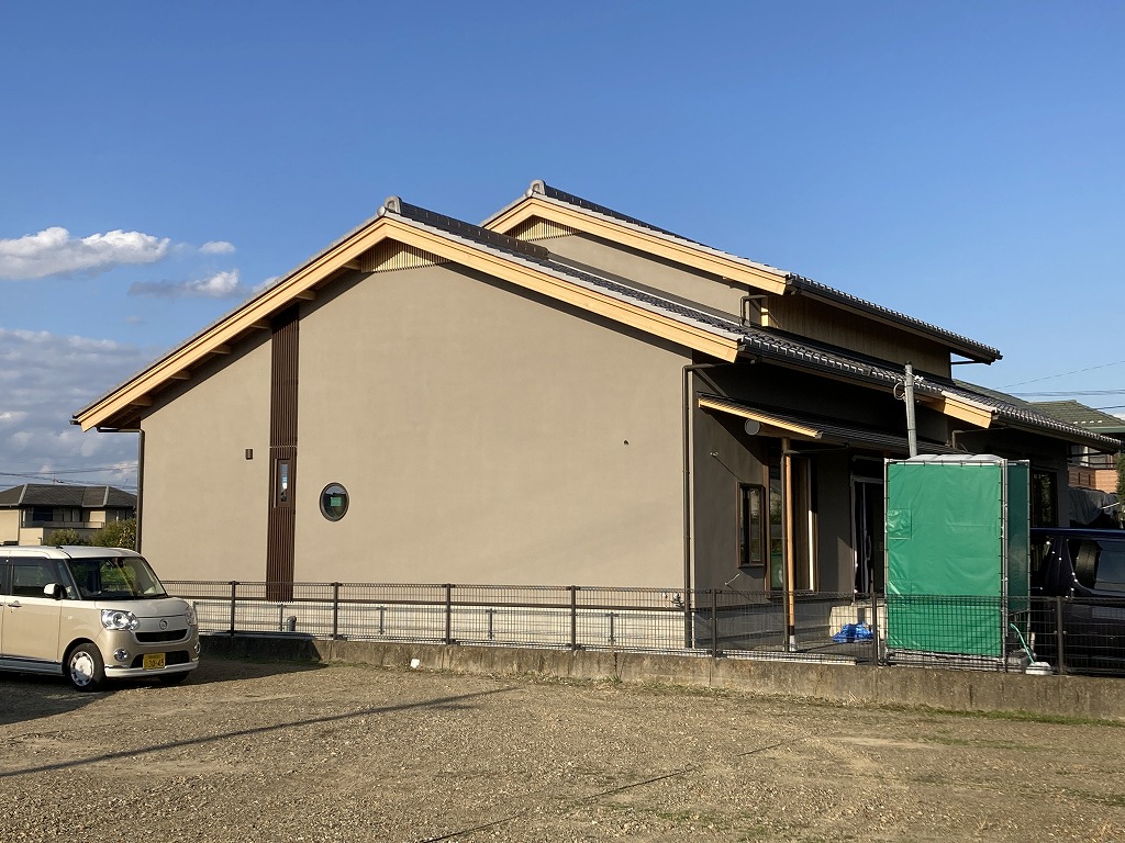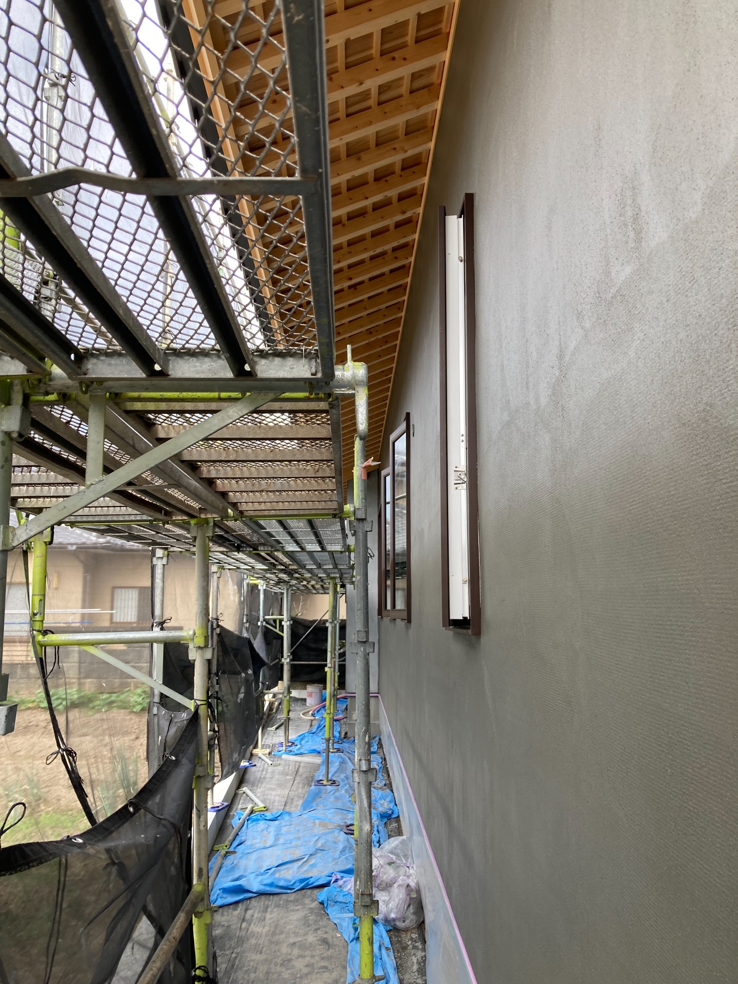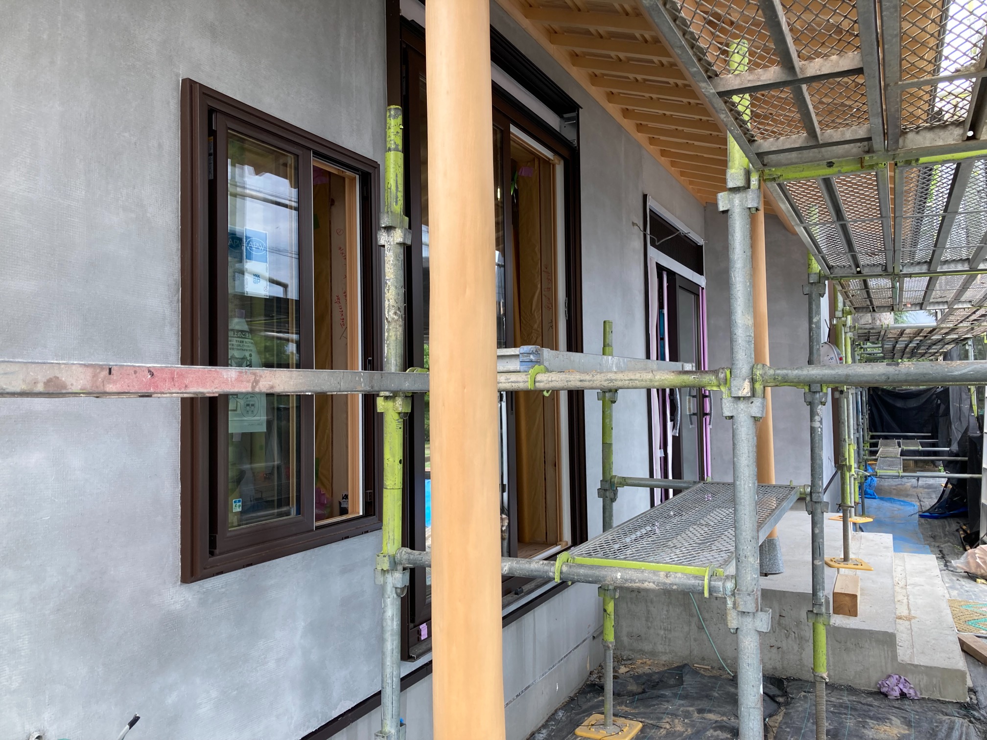 外部格子が全て取り付けられ、足場が撤去されました。ジョリパッドは壁に吹付で細かな凹凸をつくる「ゆず肌」仕上げです。