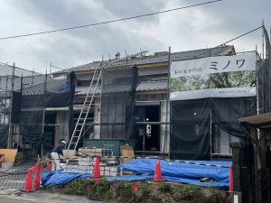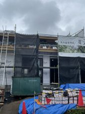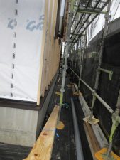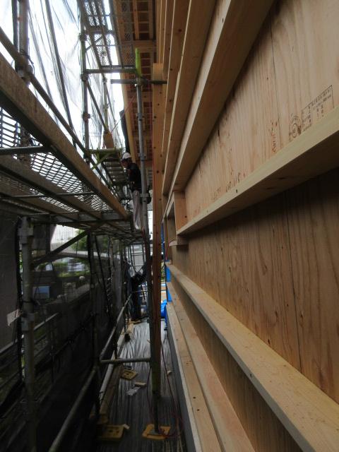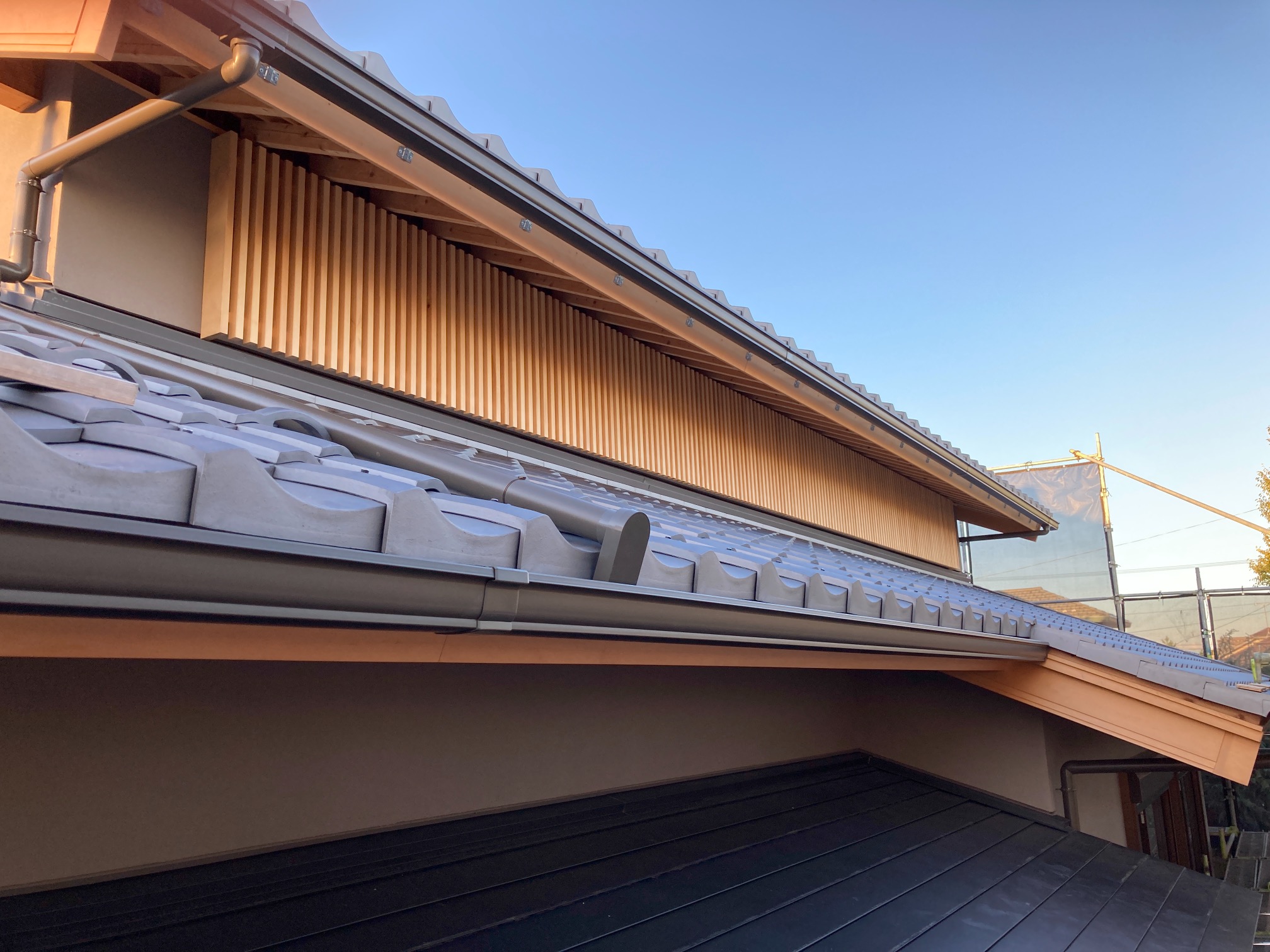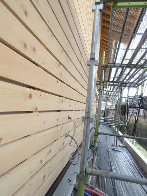 外壁の仕上げが終わり、南面に木格子がつけられました。足場がまだとれていないので引いた画像がないのが残念ですが、格子が付いたことで和風の重厚感が漂っています。