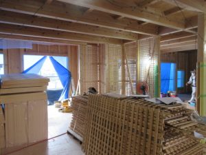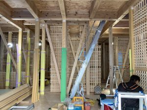 さすがが段取り上手のk池棟梁です。事前に準備された小舞(土壁を塗り付けていく桧の格子状の材料)の取り付けに入っています。