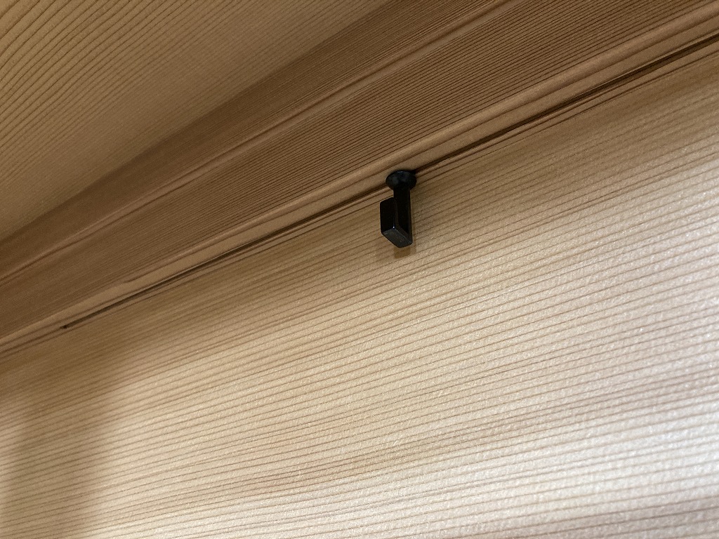 k池棟梁は床の間の造作に入っています。奥の壁には織部板と軸吊りが3つ取り付けられました。中央は固定ですが、左右の金具は動かさる仕組みです。