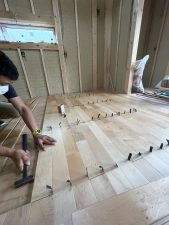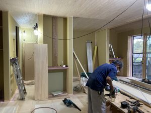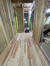 室内は3人の大工さんで作業中です。LDKはメープル材、寝室などは杉材が使われています。