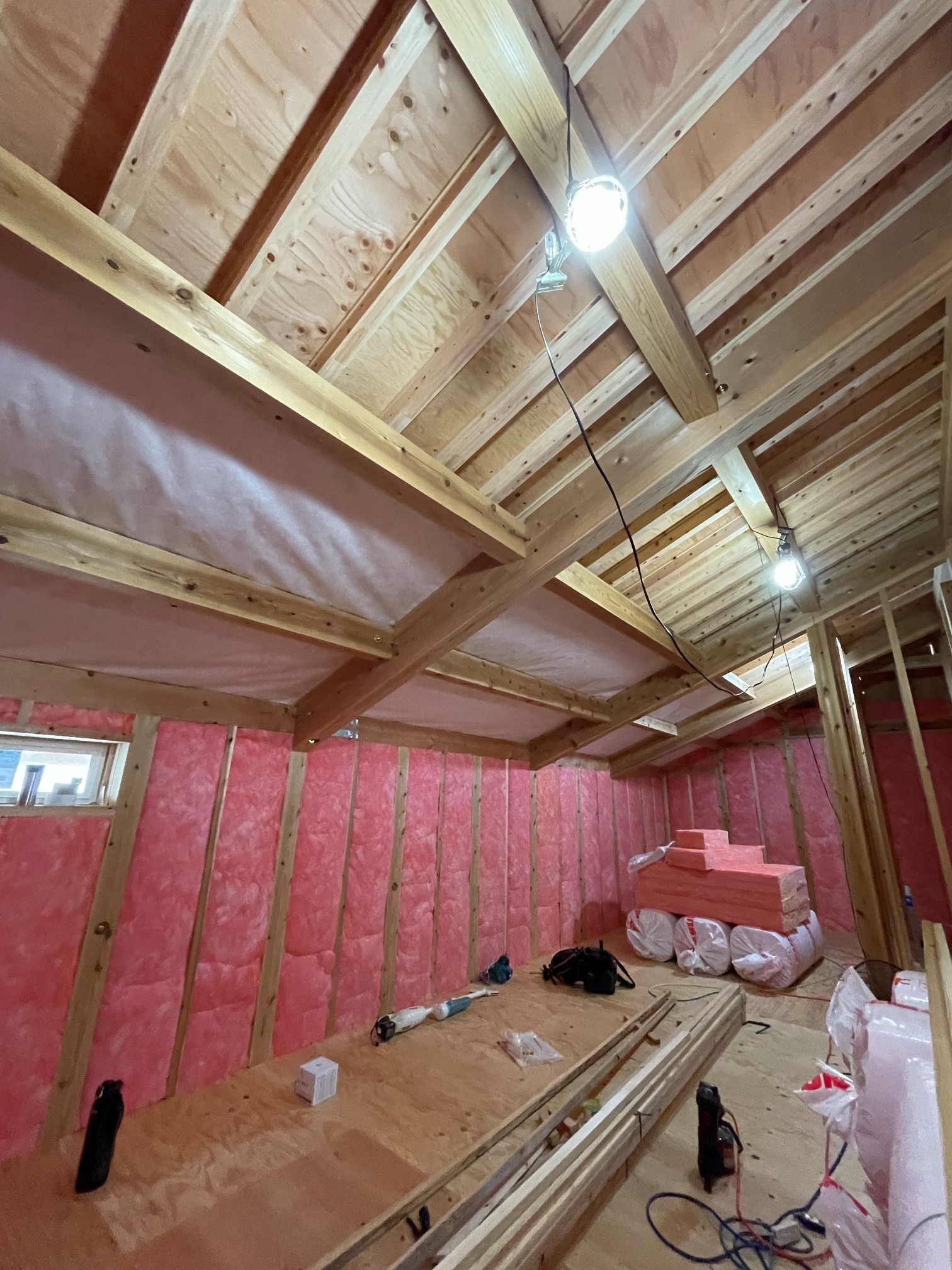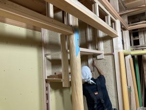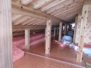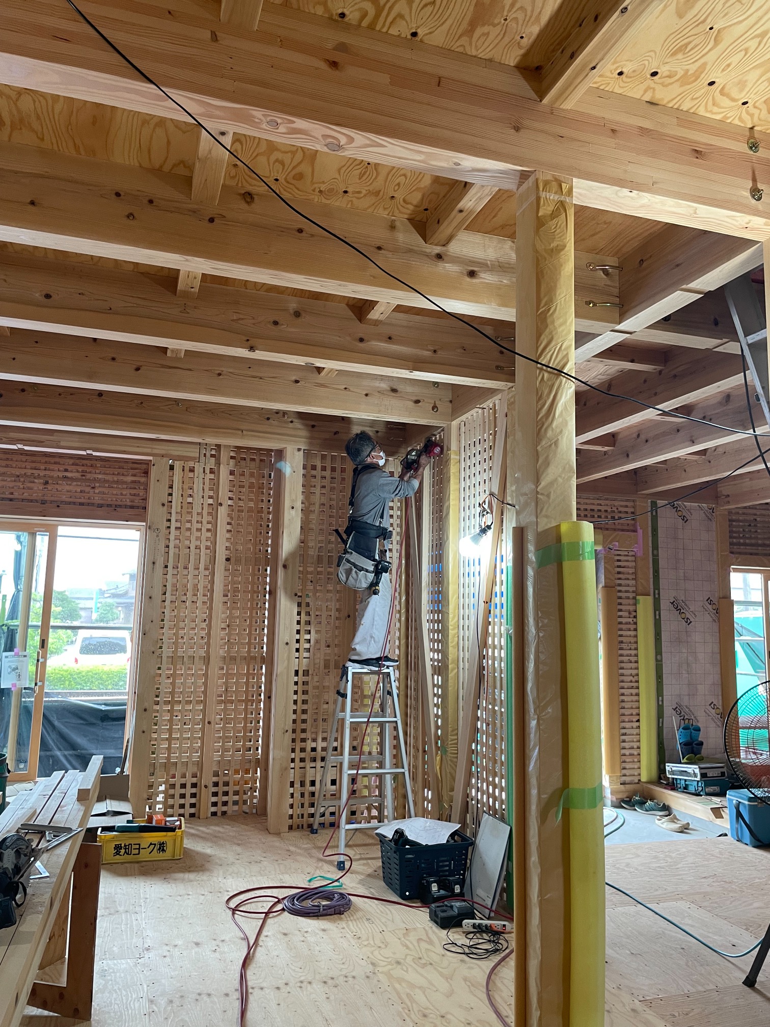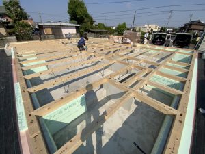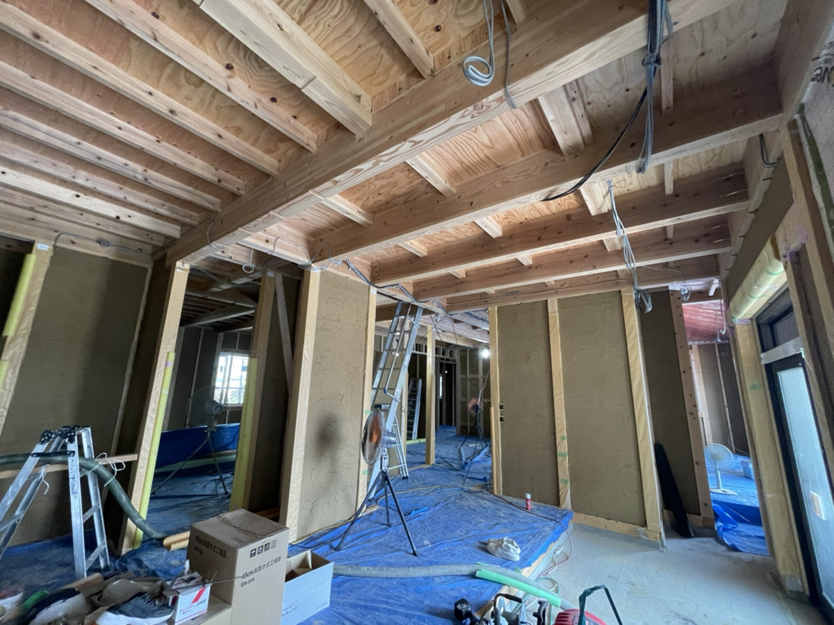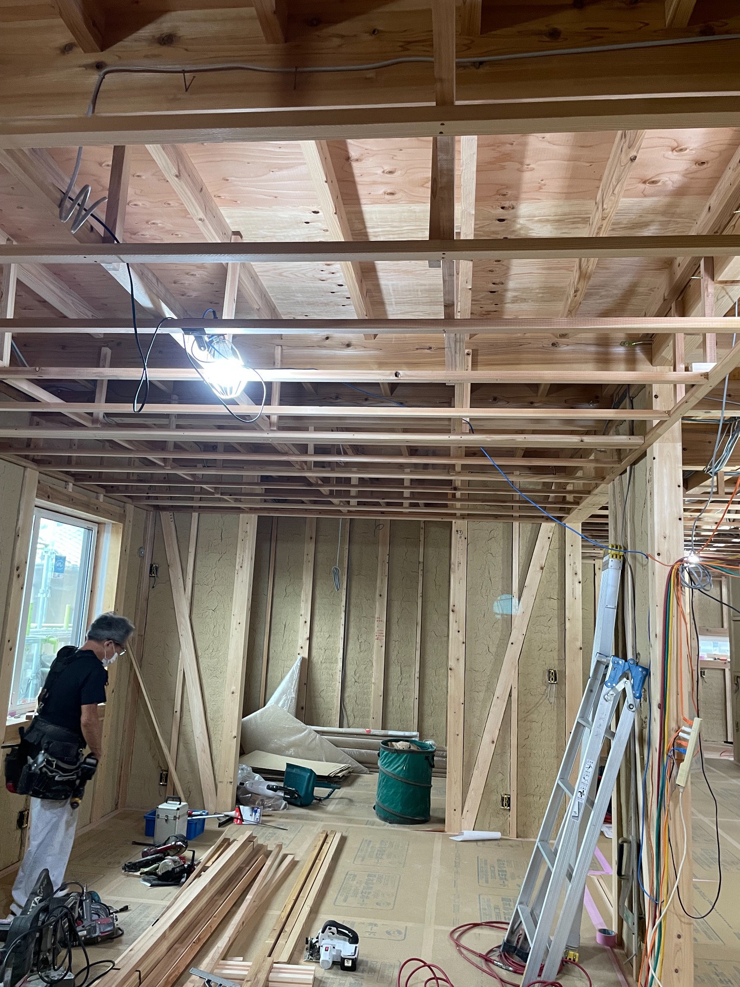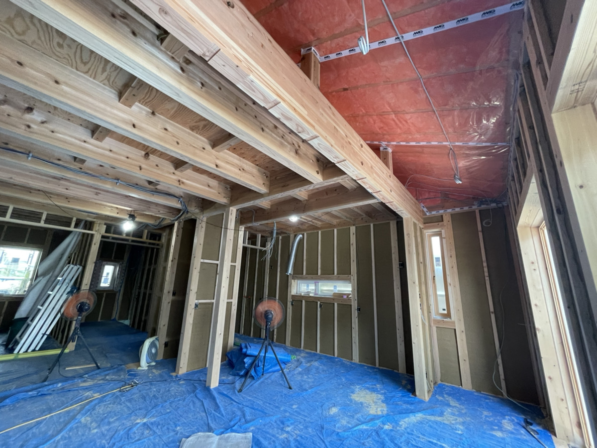 内部は天井断熱(高性能グラスウールt=155を2段み)の充填中です。大工さん曰く、断熱施工後の室内はとても快適になり、夏の猛暑での作業もしやすくなるそうです。