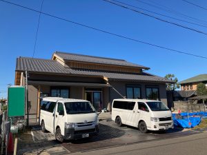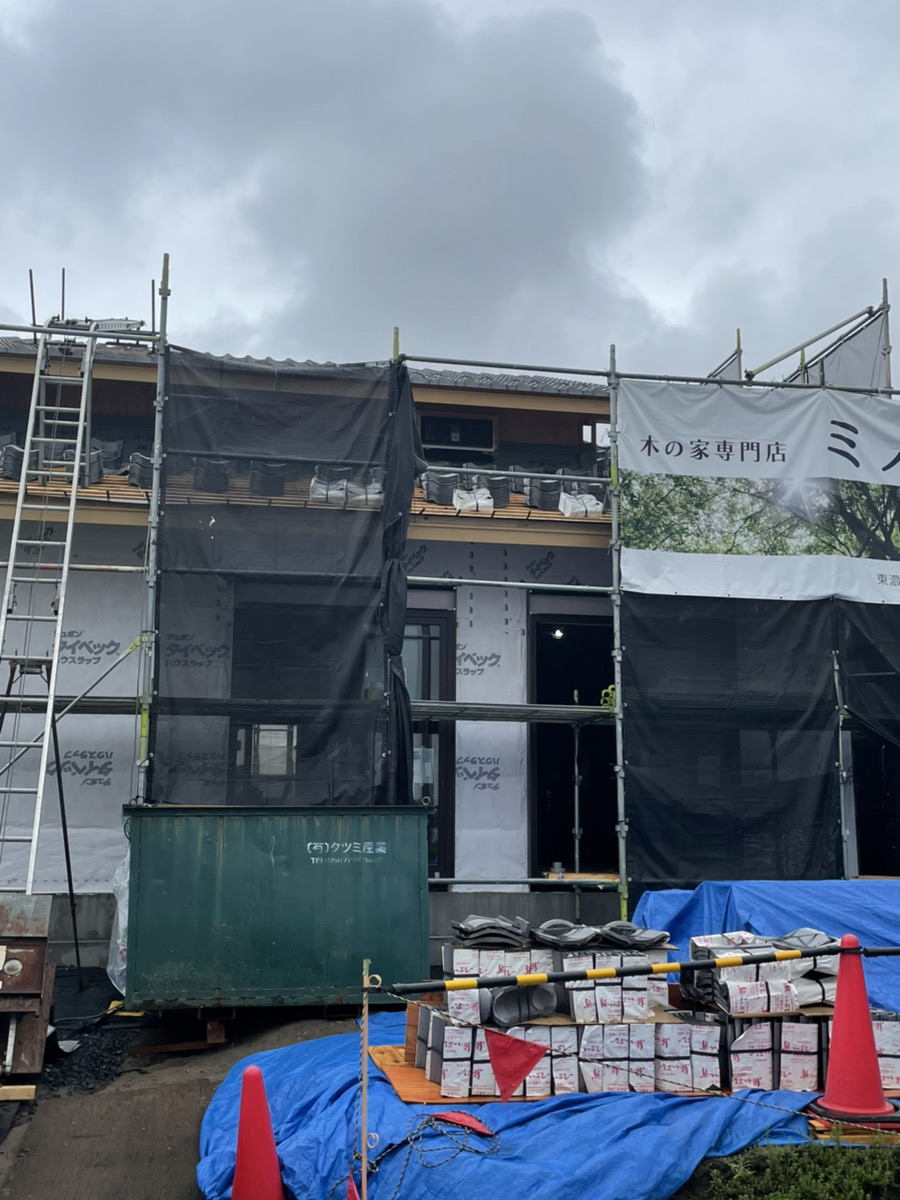 外部は付加断熱充填後の気密シートが貼られました。屋根瓦が搬入されていますが、今日はあいにくの雨。天候を見ながら瓦を葺きを行います。