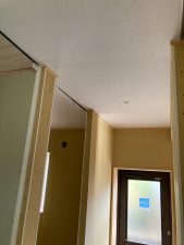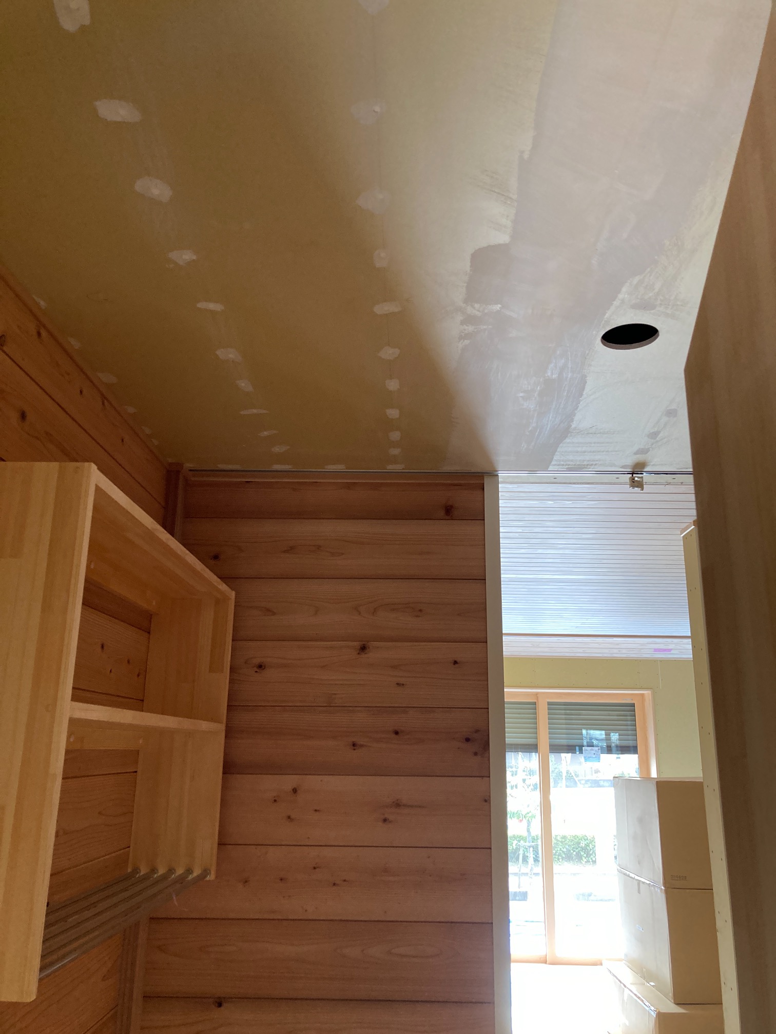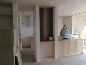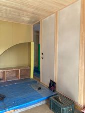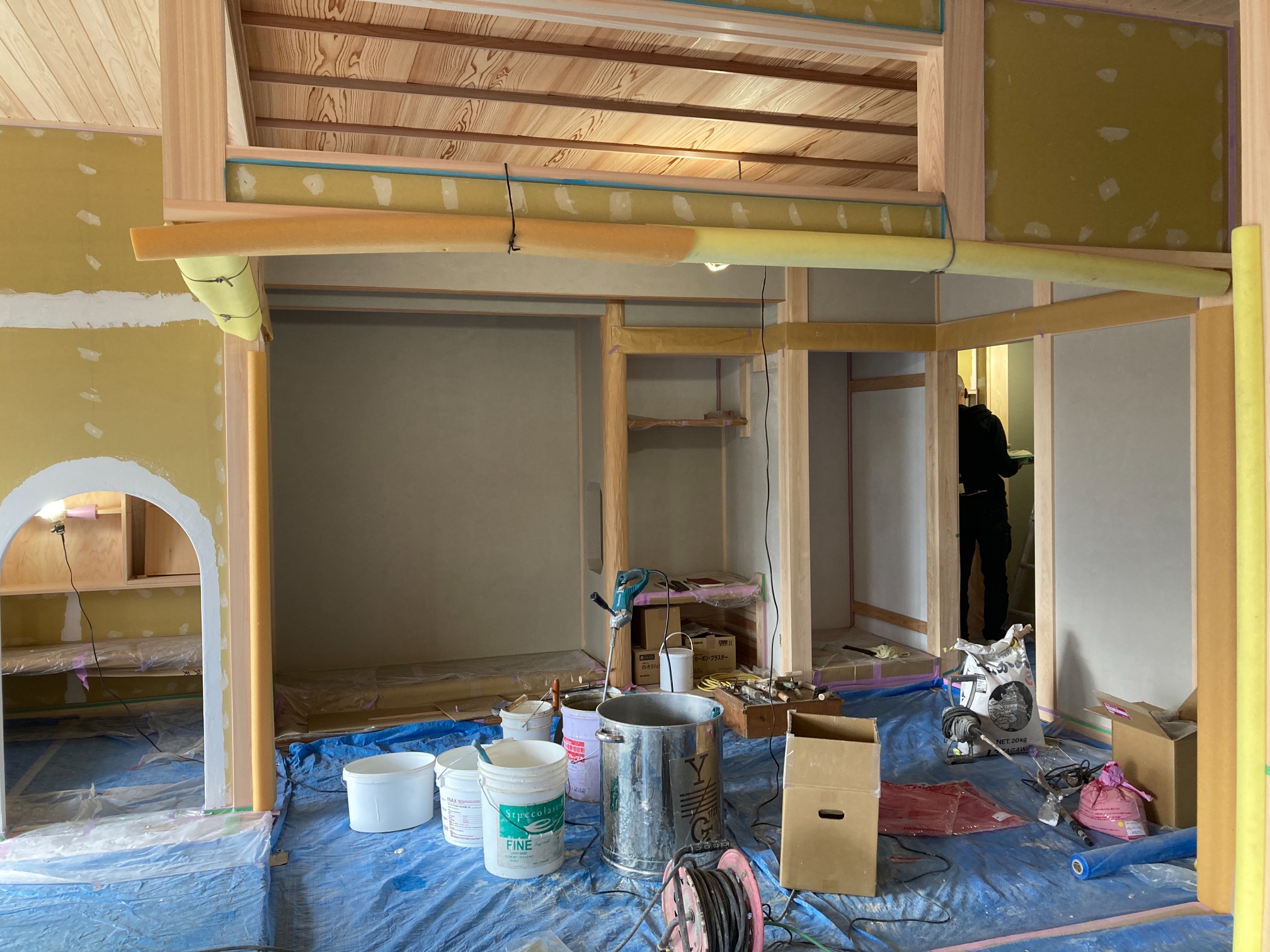 室内のクロス工事が終わり、真壁・珪藻土仕上げの中塗りと石膏プラスター下地塗りが始まりました。
