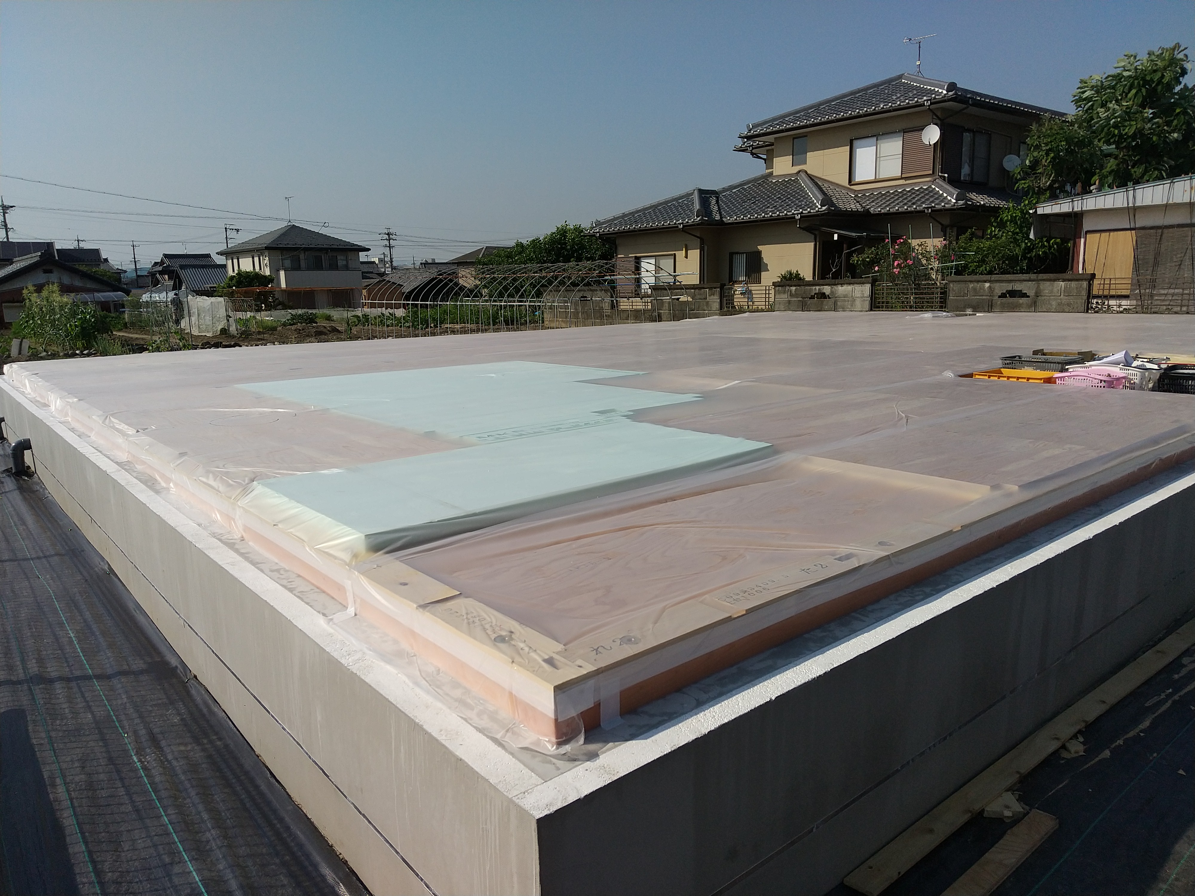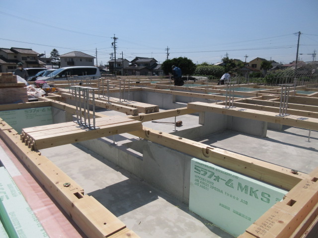 鋼製束が必要な場合は、土台に束を接着→乾燥→ひっくり返して伏せられます。見えなくなってしまいましたが、基礎下の土間コンの全面には断熱材がしっかり敷設されています。
