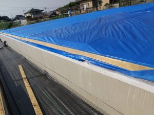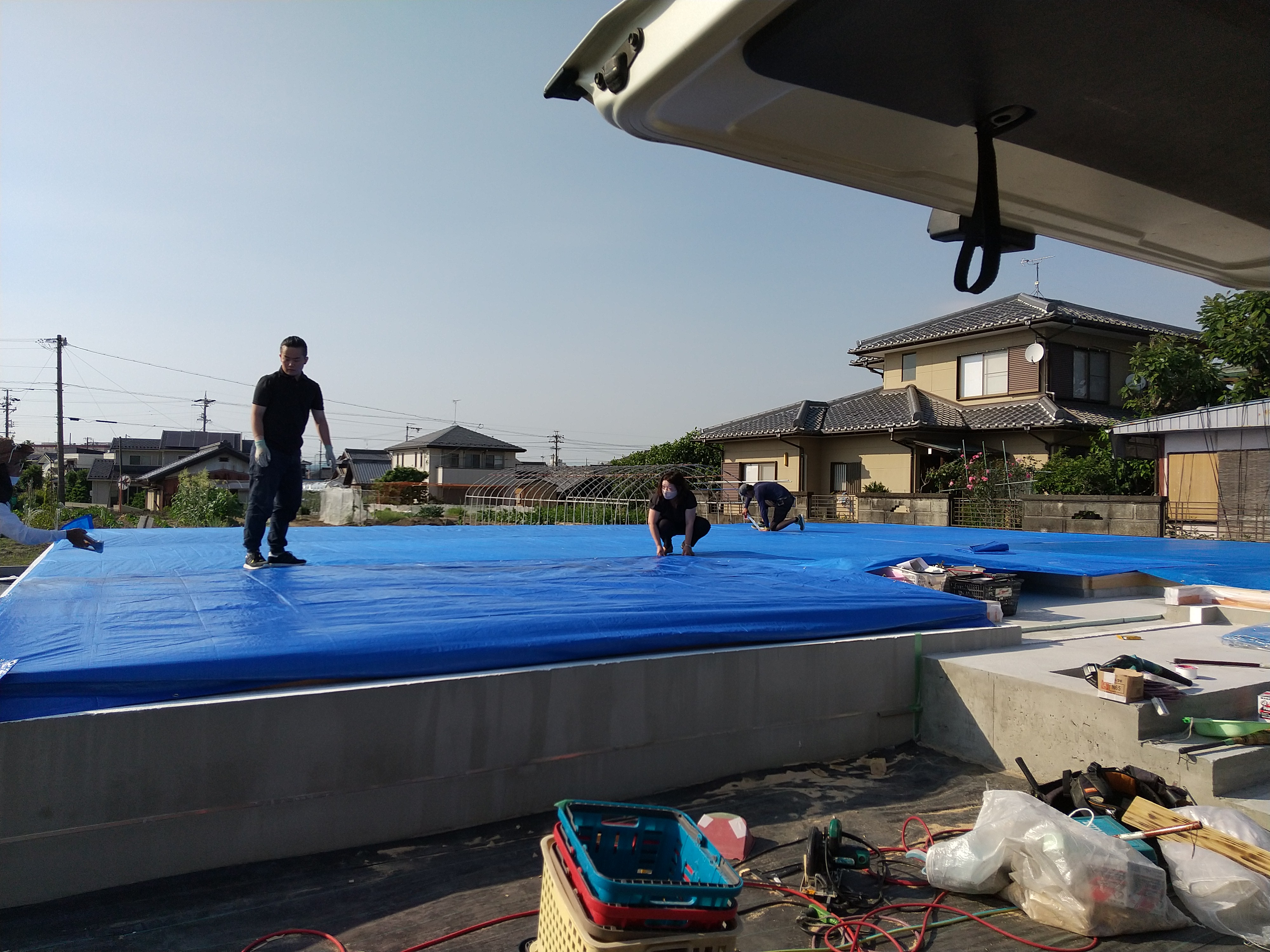 雨に濡れないようにブルーシートで養生されました。まもなく上棟です。