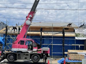 上棟翌週、きれいな空です。今日も大工さん数人で外部作業を主に作業しているのでちょっと見学に・・。ミノワ本社がある黒川から来ていただいているt植さんのピンク色のクレーンは目印になります。