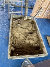 内部は土壁塗りが続いています。今日は1人で作業しているy口左官さんです。塗り・土さし・ポンプを使った土の搬入すべてこなしてみえました。土壁・断熱材を組み合わせることで、室内は土壁で蓄熱しながら外部からの熱の移動を遮断するのです 。大型の扇風機が写っている画像は右壁の2日前に塗られた壁は大分乾いてきています。まもなく梅雨が明けるので乾燥も早そうです。