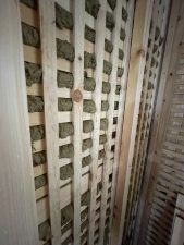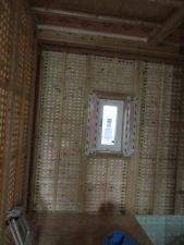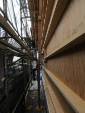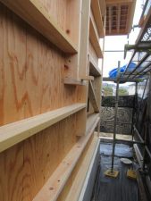 室内外壁側の断熱材(フェノールフォームt₌50)を充填後、新たに搬入された小舞を取り付けていきます。