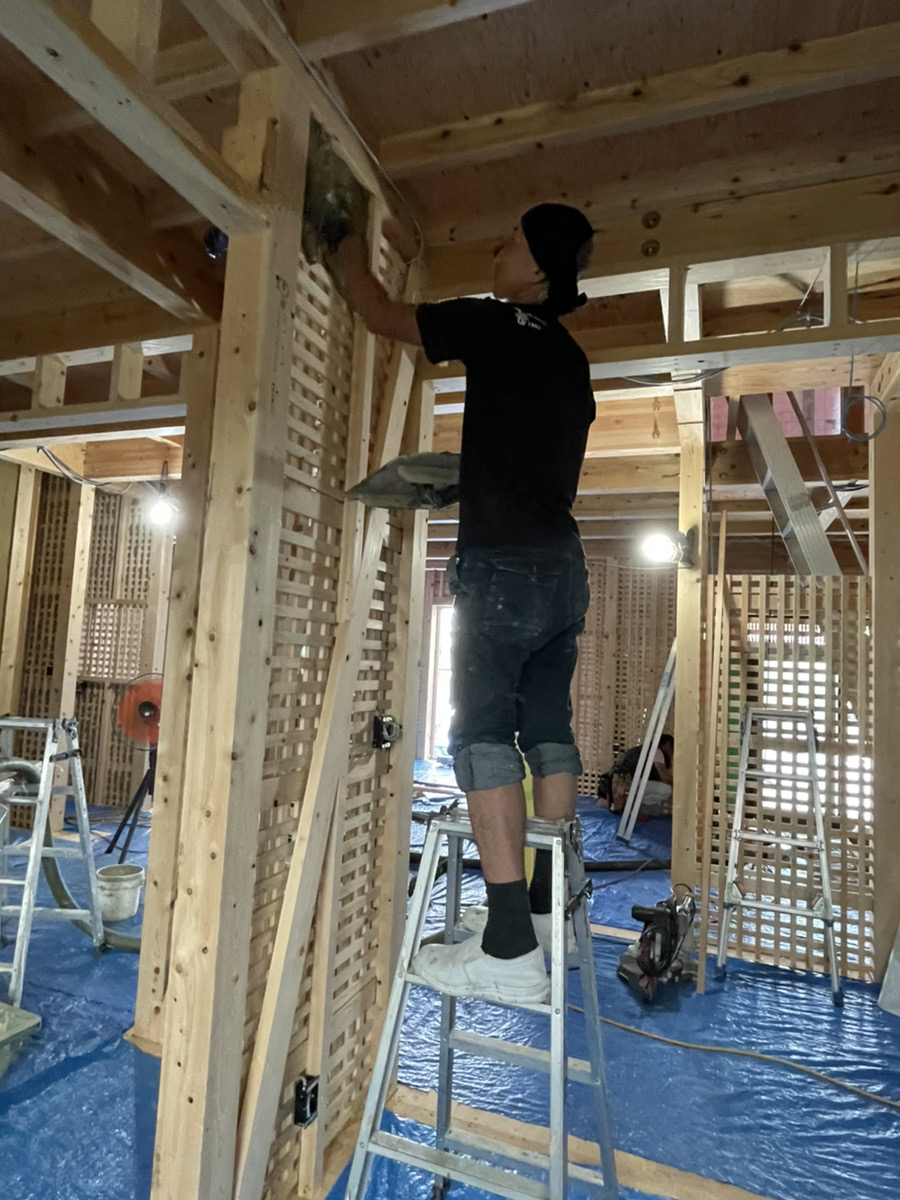 大壁は荒壁施工後、木下地をつけプラスターボードを張っていきます。プラスターボードの凹凸をパテ処理し、その上からアク防止・仕上げの接着を強化するためシーラーで下処理をしてから仕上げします。