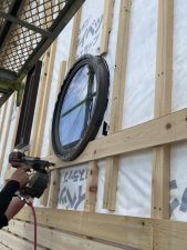 k大工さんが丸いサッシの形ピッタリに野地板を切っています。今日も日差しが強いので、なるべく日陰から進めていきます。
